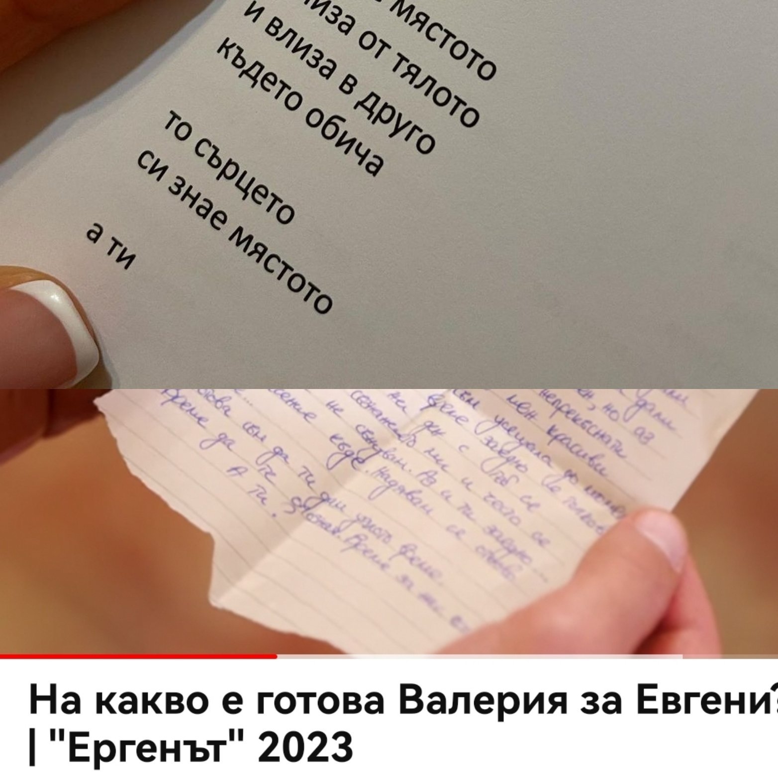 Знам, че ме конспиросахтве, че съм от Продукцията (защото твърдя, че Валерия е победителката) и казах, че няма да коментирам повече, но имам интересно попадение относно писмата на Валерия и Евгени. От януари 2022 в инста има пост на Валерия със стихотворение, което завършва на "а ти", което явно харесва. Нейните писма също завършват на " а ти",май тя си ги пише сама. Също ми направи впечатление, че коментарът "Габи ни го каза" от 103 стр е изтрит. Май наистина са си влюбени хората.