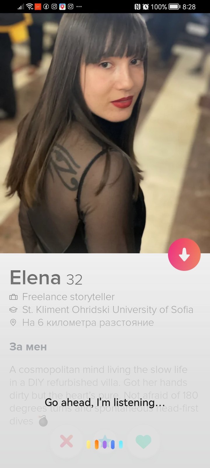 Тиндер профила на Елена е по-скоро фалшив. Независимо дали са победетелки или не,мисля че всички трябва да поддържат версията че много харесват Евгени докато ги дават по ТВ,че са още в предаването. Доколкото си спомням и Лиа обяви,че е сгодена след като излезе и стана ясно,че не печели тя. Защо Елена,една от главните героини,ще си направи публичен профил в сайт за запознанства?