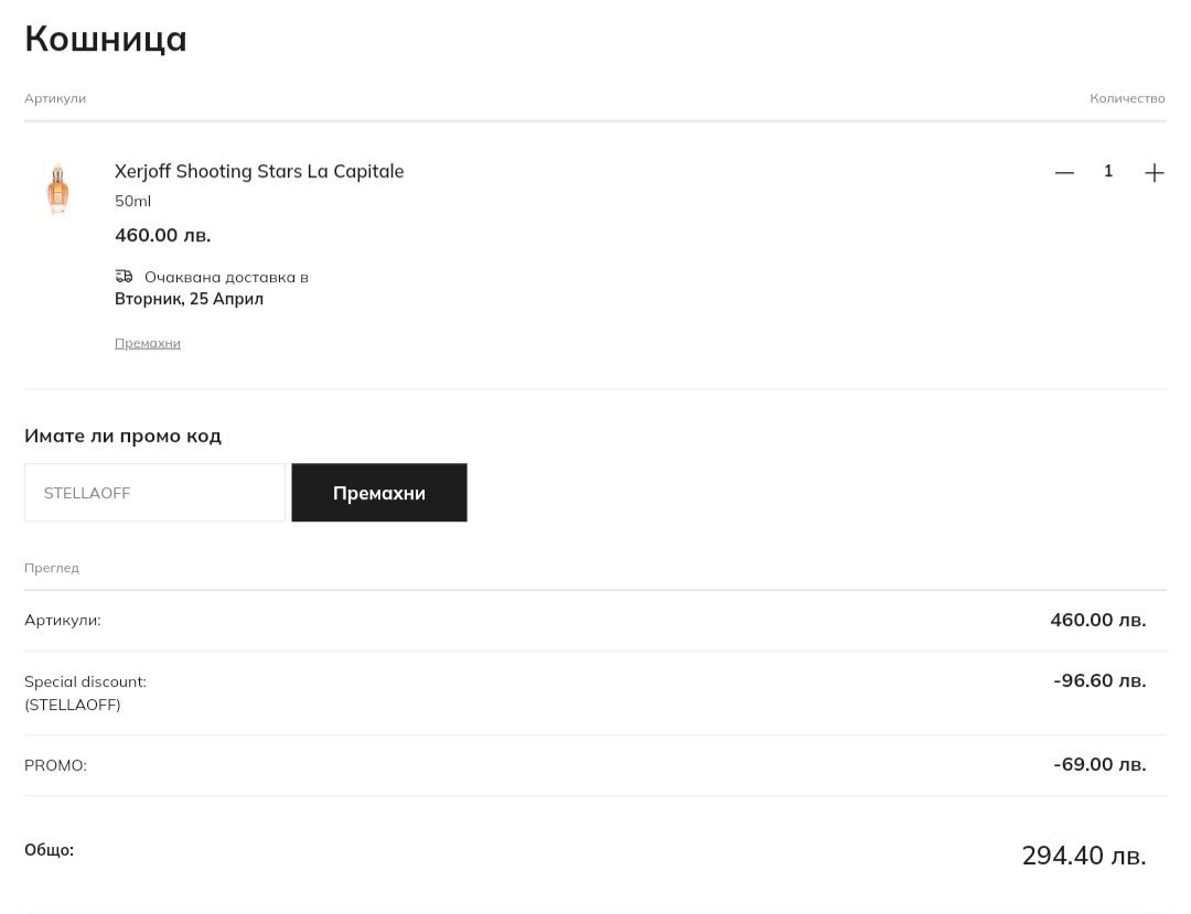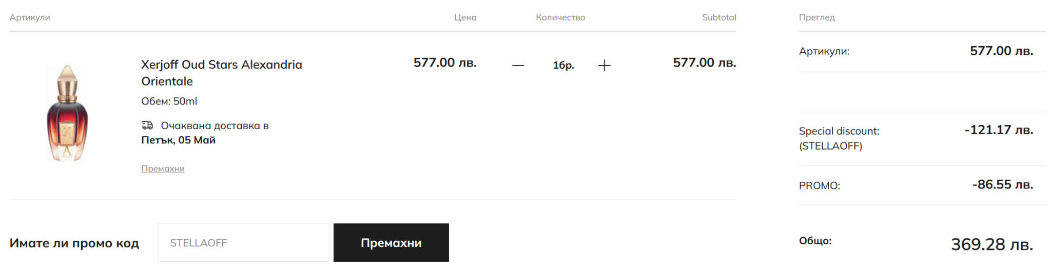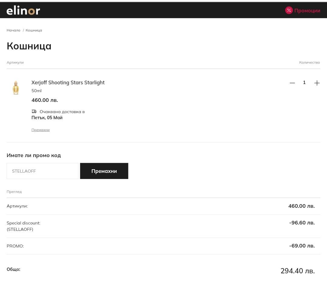 Чакам два парфюма от Елинор с код DANIELA21. Пробвах ги със STELLAOFF и разлика в цената няма...