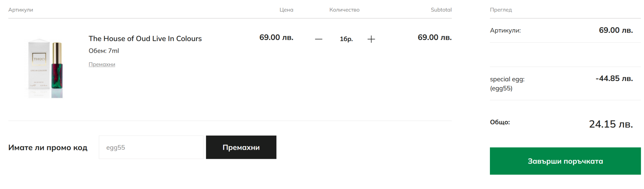 Много странни неща се получават в Елинор. Пробвах различни комбинации и с Olibanum от 57лв. се получи уникална цена: от 448лв, цената стана 224лв.! Сега очаквам да ми откажат поръчката Joy Аз отказах предишните на същите парфюми, които излязоха малко над 300лв. Странна работа..