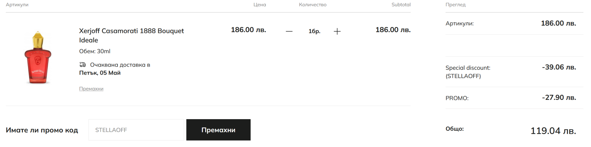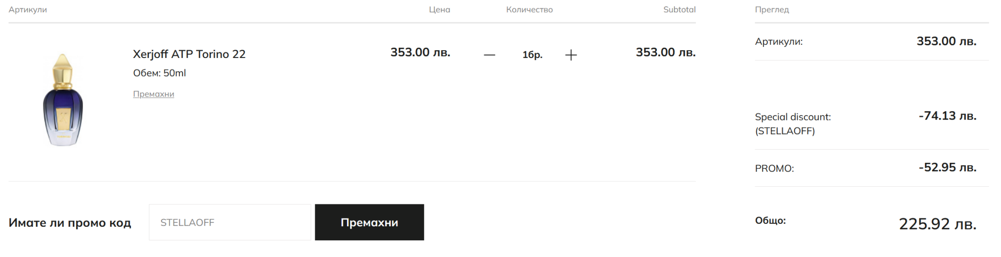 И аз се възползвах от страхотния код в Елинор и получих 36% на Xerjoff. От 3 години дебна Shunkoin и сега ми излезе на цена без аналог - 213лв.