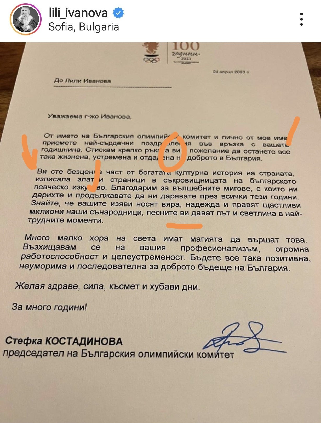 Гледам честитката на Лили Иванова от Стефка Костадинова по случай рождения ден и се потрисам. Как е възможна такава неграмотност?! "Стискам ръката ви" с малка буква, въобще учтивостта е сбъркана цялостно. Айде, тя спортист човек, ама няма ли някой по грамотен. Как ще си позволят да пускат такава нелепа честитка?! ]Интервали, запетайки, всичко туш...