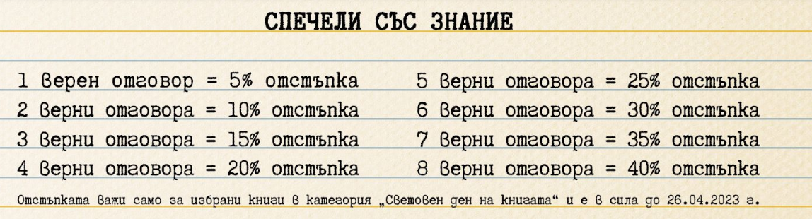 През декември 2021 г. някои отстъпки включват: 20% отстъпка на всички заглавия в Ибис, и до -50% отстъпка на книги от 01.12.2021 г до 06.12.2021 г в Orange Center; през юли 2022 г. някои отстъпки включват: до 50% отстъпка за всичко в Booktraiding и 30% отстъпка за избранi заглавия в Сиела; през август 2022 г. някои от отстъпките включват: 30% отстъпка на всички книги в Сиела, до -30% намаление в Хеликон и различни промоции в Booktraiding; през септември 2022 г. някои от отстъпките включват: -30% отстъпка за всичко в Бард, и 20% отстъпка за избранi заглавия в Хеликон; през октомври 2021 г. някои от отстъпките включват: 30% отстъпка на всички книги в Труд, и до -50% намаление в Хермес; през ноември 2021 г. някои от отстъпките включват: до -50% на избранi продукти в Българска история и до -50% намаление на всички книги в Ентусиаст; през април 2021 г. някои от отстъпките включват: -50% на 20 заглавия и -30% на 70 заглавия в Асеневци, както и до -20% намаление онлайн в Гринуич; през май 2021 г. някои от отстъпките включват: всички романси за 4 лв и всички детски книги за 2 лв в Artplus, както и до -50% отстъпка за всички книги в Сиела; през юни 2021 г. някои от отстъпките включват: 20% отстъпка на всички книги в Booktraiding и 30% отстъпка на избранi заглавия в Helikoн; през януари 2021 г. някои от отстъпките включват: 30% отстъпка на 30 избранi книги в Книгоммания, 25% отстъпка на 150 книги в Колибри, -10% на книги в Ozone от 13.01.2021 г до 17.01.2021 г и 35% отстъпка за всички книги през цялата година в Orange Center; през февруари 2022 г. някои от отстъпките включват: 32% отстъпка за 32 книги с любовни романси в Бард, 15% отстъпка за всички продукти от категорията Хари Потър в Буква, и 30% отстъпка за над 200 заглавии в Колибри; през март 2021 г. някои от отстъпките включват: до -50% на избранi издания в „Българска история“, -20% на всички книги в „Бард“ и 30% отстъпка на всички книги на издателство „Еднорог“ от 1 март до 8 март.