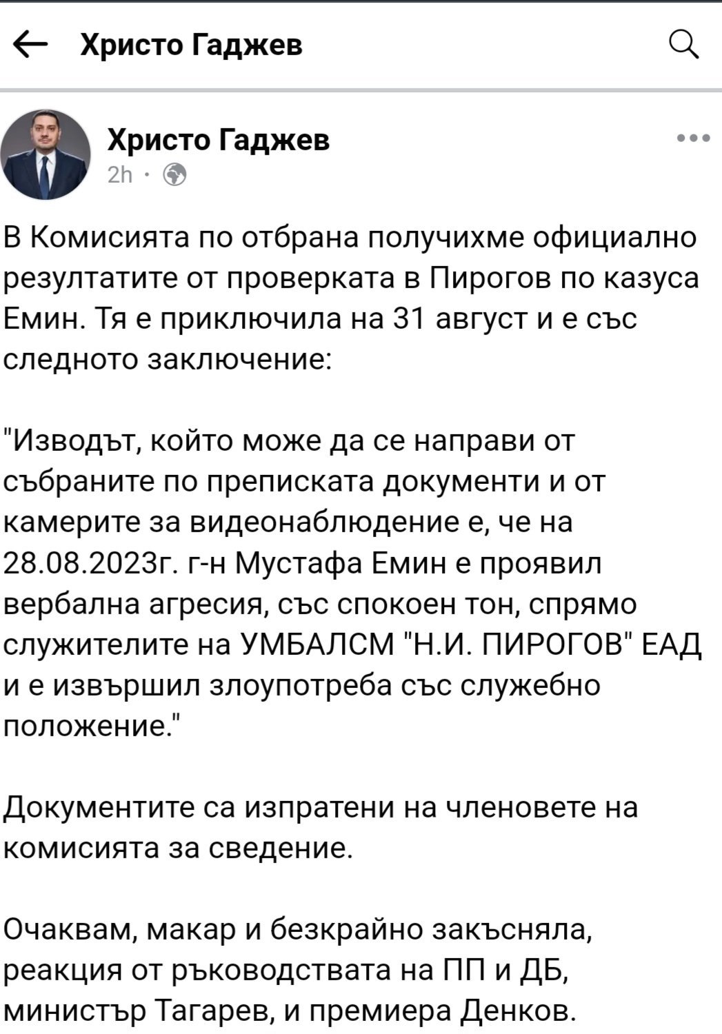 Ето го постът на самия гаджев. Комисията по отбрана не е разследвала нищо