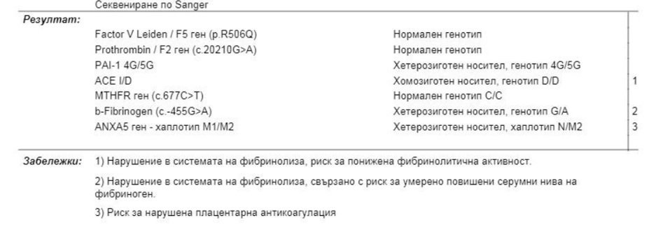 Yan25 мутациите са ми ТАФИ и този за усвояване на витамините от Б групата. Нямам предишни загуби заради тромбофилия, бяха ми пуснати преди ин витрото в Турция.