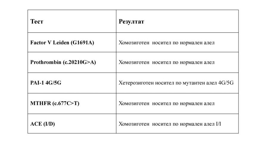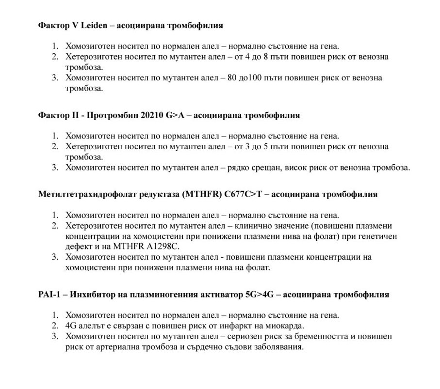 Генетичните изследвания за тромбофилия включват фактори като Фактор V Лайден, Фактор II Протромбин, Plasminoogen Activator Inhibitor 1 (PAI-1), Метилентетрахидрофолат редуктаза (MTHFR), Ангиотензин-конвертиращ ензим (ACE), Метионин синтаза редуктаза, Васкуларен ендотелен растежен фактор А (VEGF-A), Прокарбоксипептидаза U (PCPU), Тромбоцитен гликопротеин IIb/IIIa, Протеин S, Аннексин A5 и Аполипопротеин E.