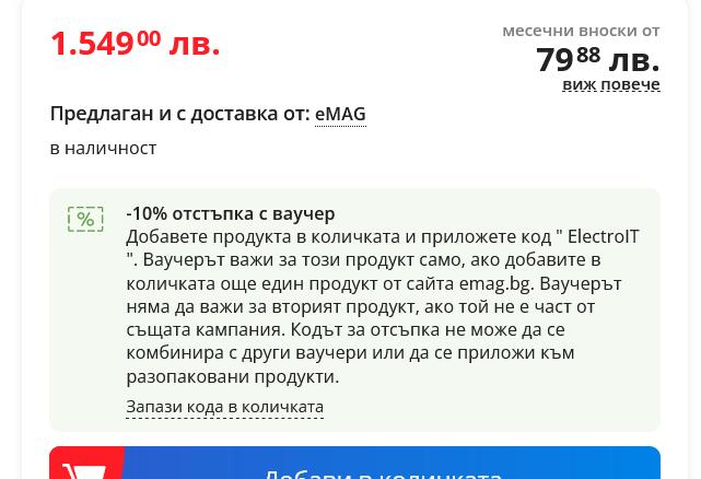 Цената пада до 1400лв. като се добави още един продукт от кампанията и се активира ваучера. Трябва да са два продукта като втория избрах нещо евтино. Редовно имат такива кампании, но с различни категории и продукти.