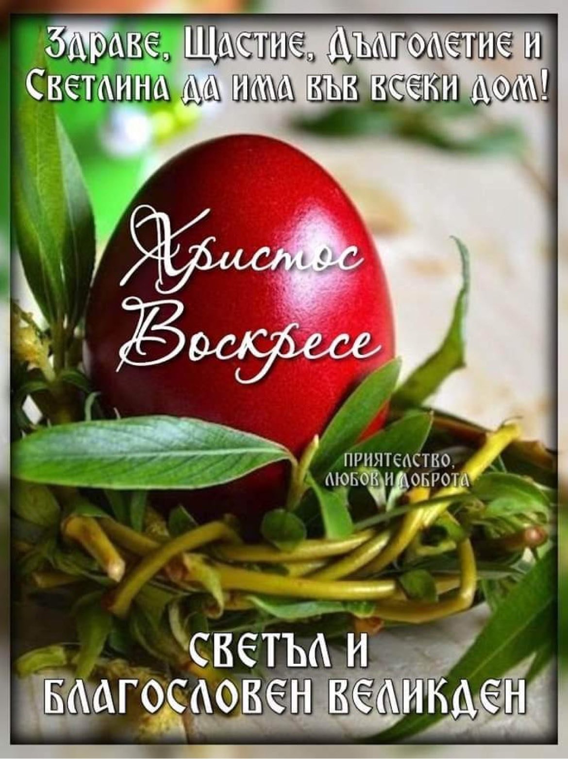 Христос Воскресе! Бъдете здрави! Повече любов, щастие, доброта и по-малко тъга в сърцата! Благоденствието да е вечен спътник в живота ви!