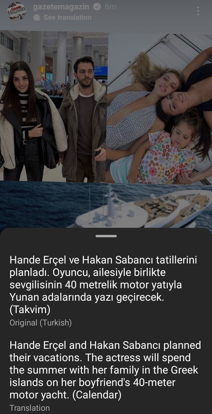 "Ханде Ерчел и Хакан Сабанджъ планираха ваканциите си. Актрисата ще прекара лятото със семейството си на гръцките острови на 40-метровата моторна яхта на приятеля си."
