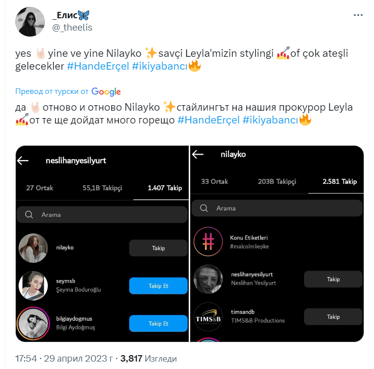 Както предполагам се досещате, не мога да взема отношение по въпроса за бъдещите проекти на нашите любимци Ханде Ерчел и Керем Бюрсин, тъй като очевидно точна и конкретна информация около техните бъдещи проекти все още няма и8или някои хора се опитват да предадат значимост на информация, промъкваща се и достигаща по невероятно различни начини до хилядите фенове на нашите любимци. Тази информация обаче е преобладаващо базирана на догадки, предположения, предвиждания и/или вероятности, че нещо с някого, някъде ще се случи! Що се касае до техните бъдещи партньори: 1) харесвам актьора Бурак Дениз заради силната роля, която направи в сериала от 2016 година „Любовта не разбира от думи“ и магнетичната  химия, която имаха с Ханде Ерчел в този сериал; 2)  колкото до актрисата Хафсанур Санджактутан, не съм гледала нито един филм или сериал с нейно участие, за да имам мнение за нейната игра и въпреки сравнително крехката ѝ възраст в шоубизнеса ѝ пожелавам творчески успехи с  който и да е партньор! Sunglasses