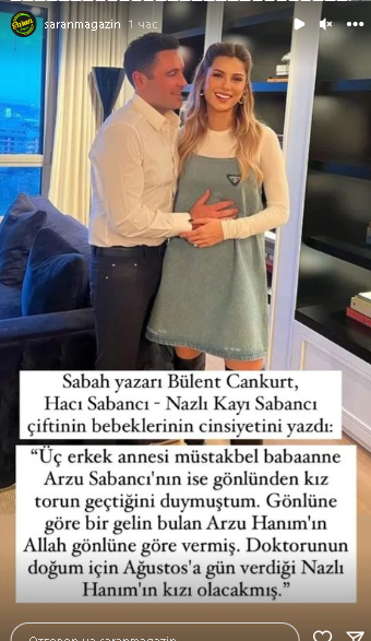 В същото време Назлъ, жената на Хаджи, големият брат на Хакан Сабанджъ, която е бременна и очаква дете през м. август, вече е научила пола. Ще си има момиченце. По този повод в медиите излезе следното:
