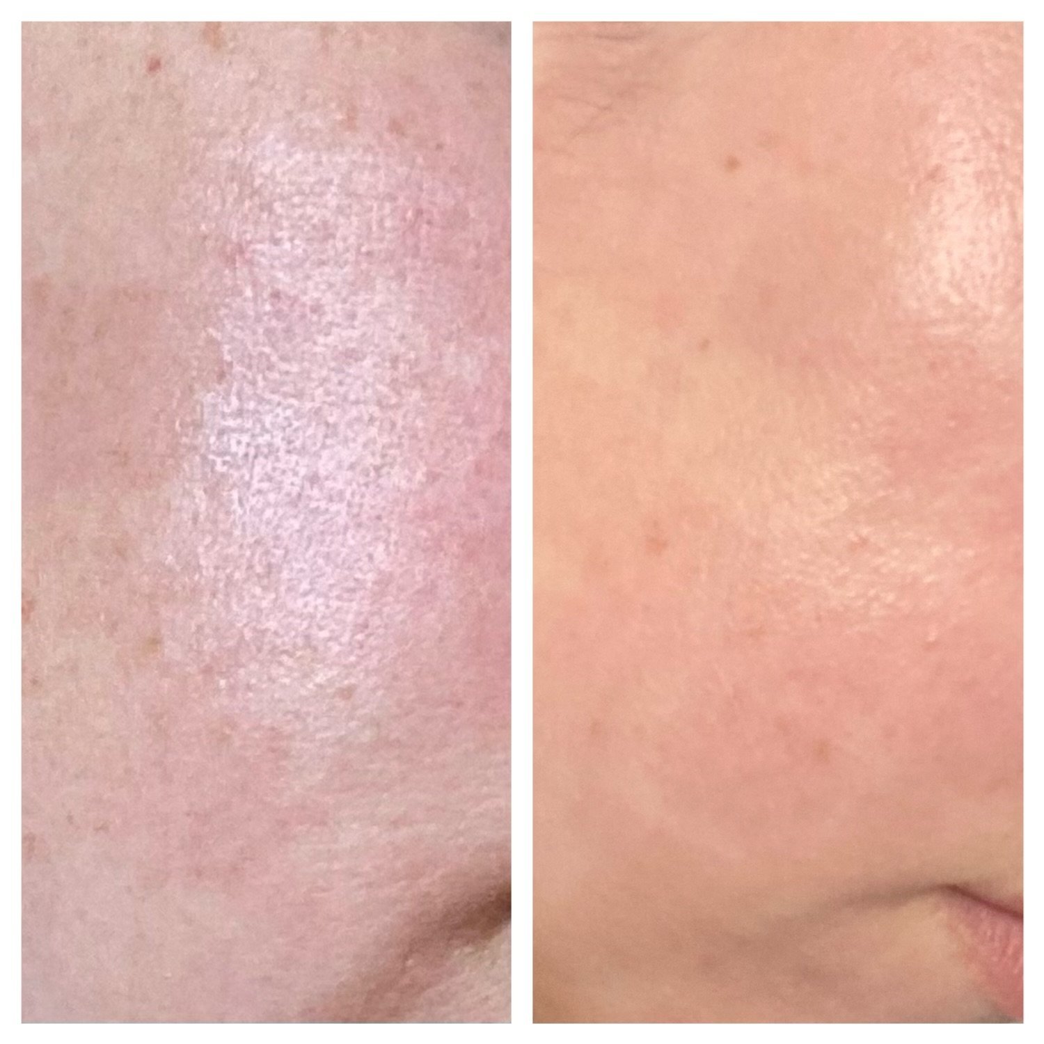 Направих едно колажче, първи ден след процедурата, да сравня между първата и втората. Една и съща буза хващам заради слънчевите петна там. Нямам представа защо осветлението изглежда различно, след като все съм на дивана в хола...