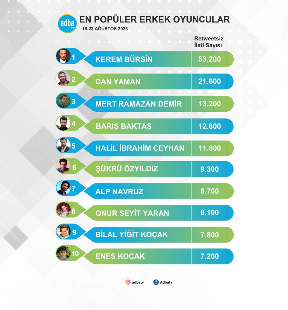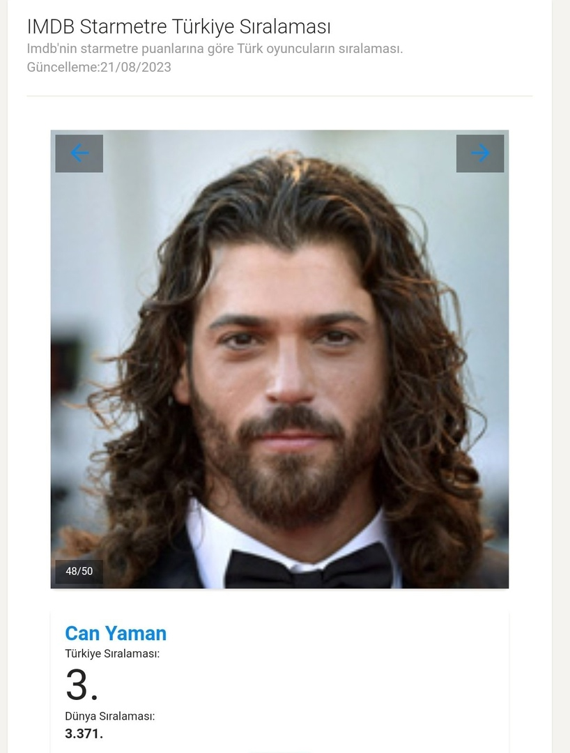 Джан Яман е на трето място🥉 сред всички турски актьори и актриси в седмичната класация на IMDb от 21.08.23. Джан Янан е позициониран като номер 3371 от 11 милиона артисти, проследявани по света.
