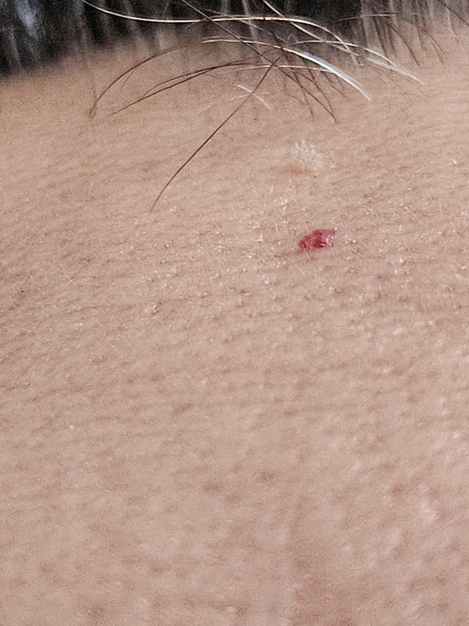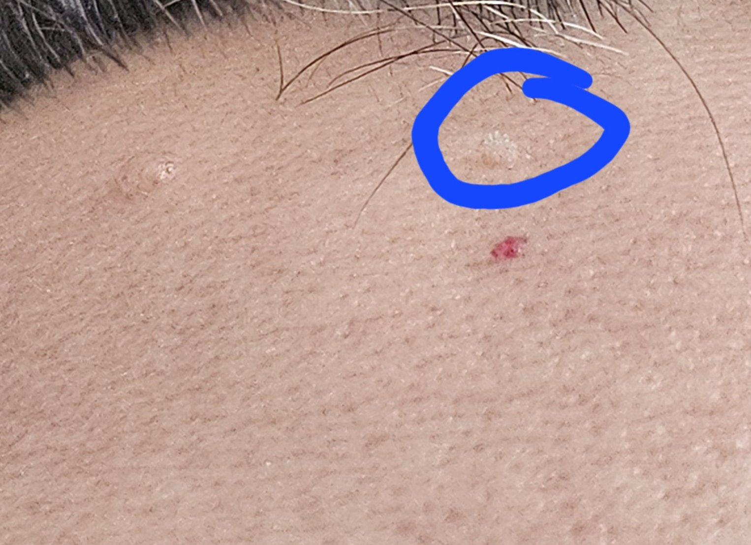 Едно образувание на челото ме изяде. Супер дребно но ме боцка и ми е некомфортно. Опитах да увелича и да го фокусирам на снимка, но много трудно. Изглежда сякаш стърчат малки бели косъмчета от него, но се съмнявам да са косми. Не знам какво е това чудо.....