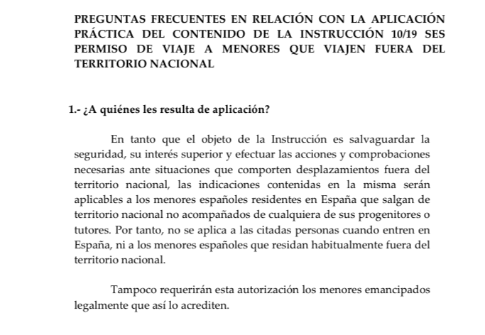 И аз разбирам, че за испанчета става въпрос. Отделно, че не се прилага за живеещи постоянно извън Испания( пак испанци). Изобщо, нищо общо с твоя случай. И изобщо не знам защо се притесняваш за такива неща. Моите са българчета, пътували са с един родител и с придружаващ, никога на излизане от Испания не са ни искали какъвто и да е документ.