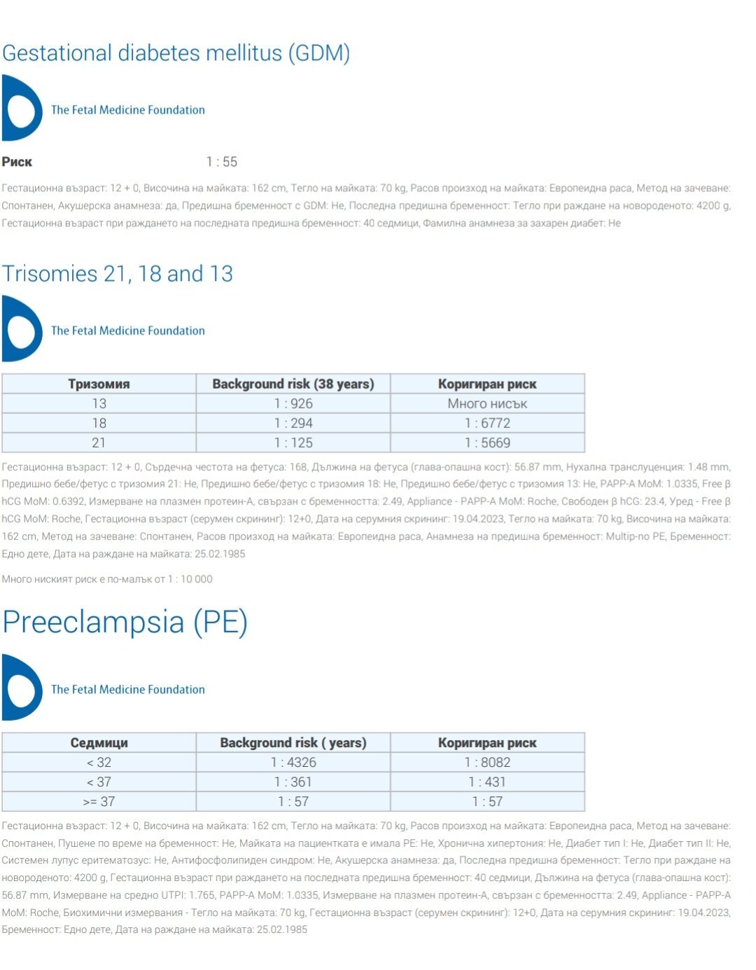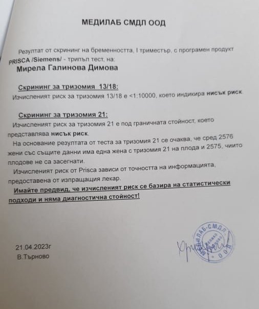 Това е скрининга. Нищо не разбрах освен нисък риск, ама явно да по друга система, не като вашата. Ще обсъдя с лекар на 3 май чак. Че трябваше във сряда, но не бяха готови....