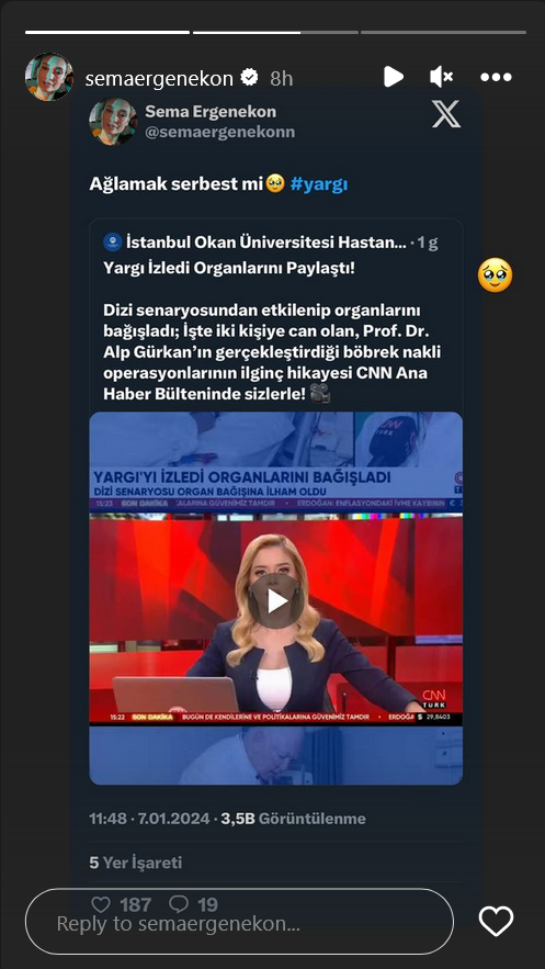 “Присъда” продължава да кара хората за говорят за тях, поради чувствителността им към социалните събития.  Пациент,  впечатлен от сцената на даряването на органи в “Присъда”, реши да дари органите си и така  даде надежда на Кенан Каяалп, който се лекува от 35 години, който получи нов бъбрек