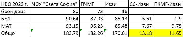 Така, ПЧМГ има 87 т. среден резултат по БЕЛ, Иззи има 85 т. Едните точки са провал, а другите са в топ 2.  Не очаквах такъв "слаб" резултат от ПЧМГ на изпит, който е елементарен и се предполага да се справят децата дори от селското училище, какво говорим за топ 2 на София. Така казано вероятно се предполага, че СМГ трябва да е изпаднало от топ 2, а което не е в топ 2, не вАжи. В ПЧМГ поне не ходят така масово децата на външни школи, явно имат самочувствие да разчитат на училищната подготовка.