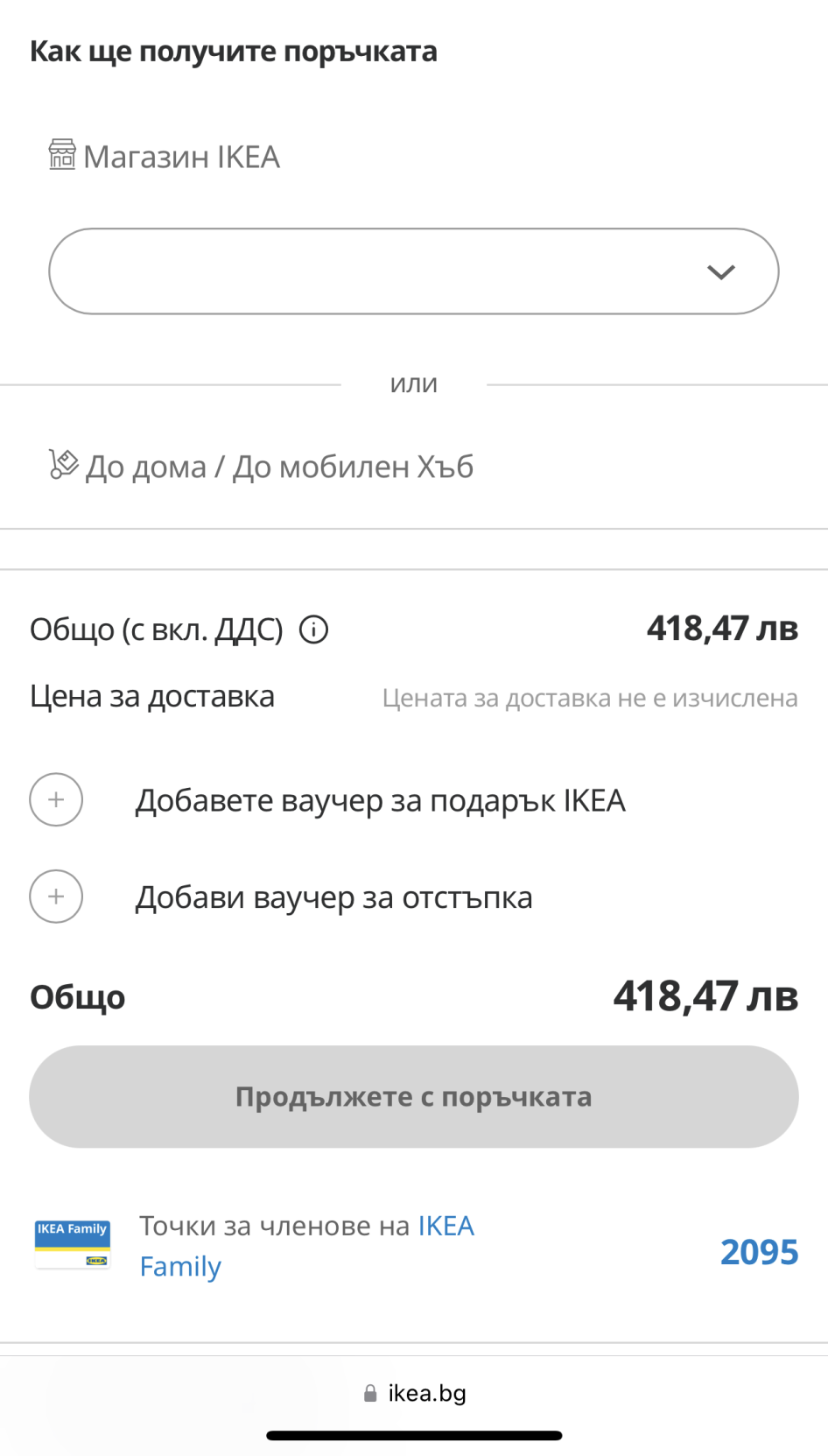 Вижте "бутон" се нарича всеки надпис в страница, който е активен и като се кликне на него, се отваря меню. Тук няма такъв надпис! Над този прозорец от вашия скрийншот с цената, няма надпис Магазин Икеа. Няма сектор "Как ще получите поръчката", нямам избор как да получа поръчката. Много благодаря, че се опитвате да ми помогнете, но ако ги имаше тези неща, щях и сама да се справя, просто не знам дали не са някъде в скрито меню от настройките, което аз пропускам. На видимия панел ги няма.