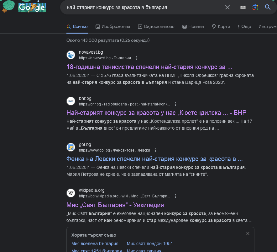 Наши медии и т.нар. медии пишат нещо си и там има "Най-старият конкурс за красота у нас..." На всичко отгоре, Гугъл ти дава 2 "версии" за такъв. Аз също си мислех, че някой "прото-мис" конкурс ще да е. Ама не излезе тъй - затова сложих и скрийншота (не съм задавал "само БГ език/източници"). Отново по писанията на наши медии.