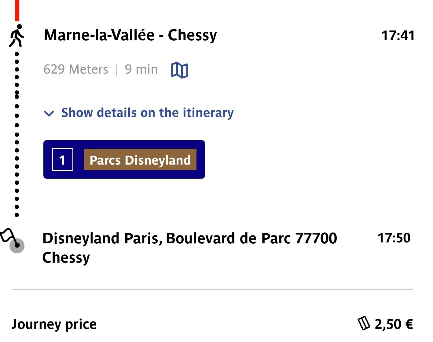 От Nation до Дисниленд (Marne la Vallee Chessy) пътувате с RER A и билетът струва 2,50. Компанията, която иска предната спирка, слиза на Val d'Europe. Гледате мотрисата да е с крайна спирка Marne la Vallee Chessy, защото има и друга с крайна Boissy-Saint-Leger.