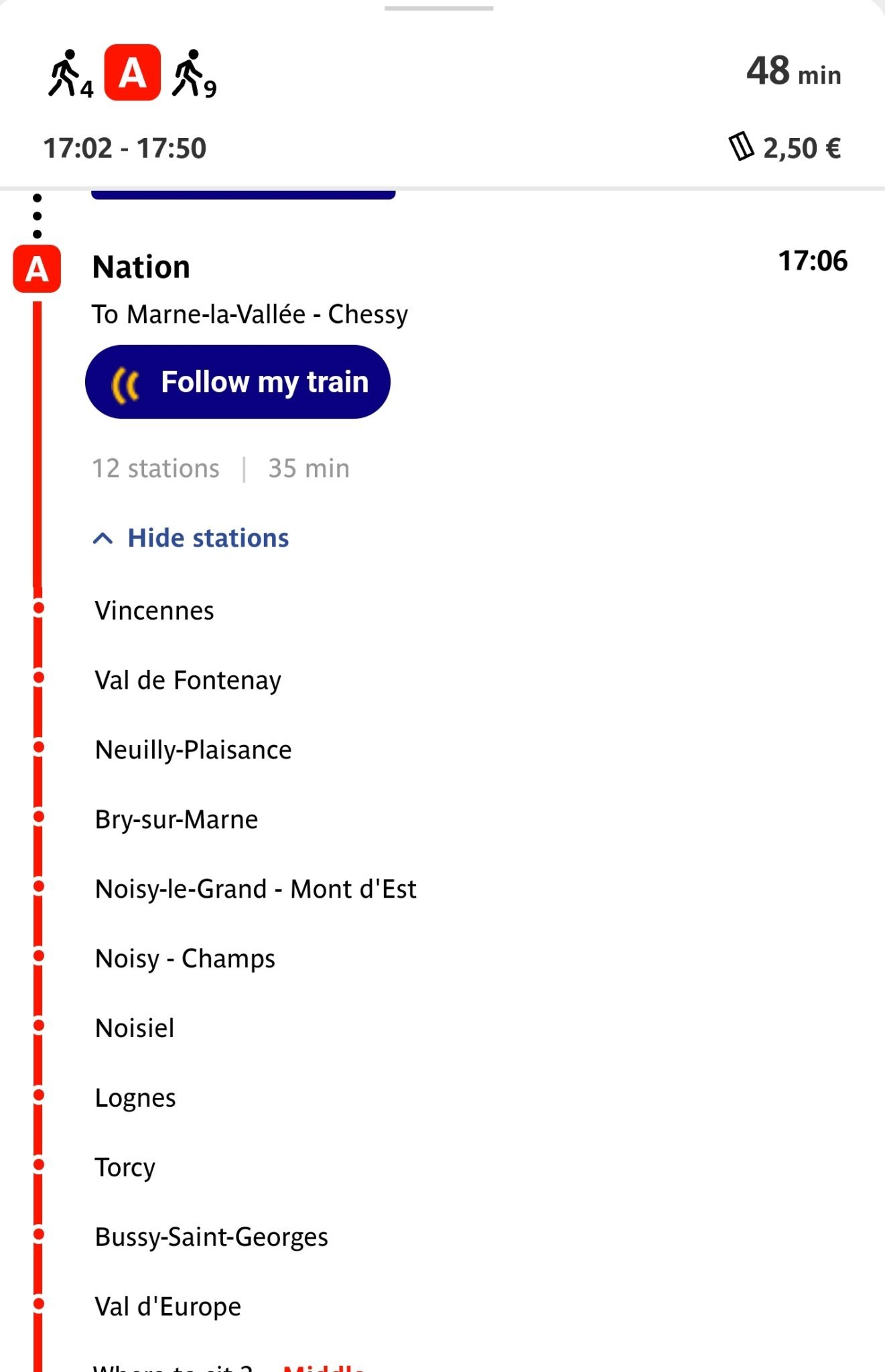 Здравейте, Моля някой  да ми даде малко по-ясно инфо: Искам да стигна от Nation до Дисниленд с PER A. Не ми стана ясно какъв билет трябва да си купя до там: до Nation ще стигна с билет за метро за еднократно пътуване 2.50 евро и оттам не мога да ползвам същия, а купувам нов , но не може да е еднократен, т.е какъв визмам. И още един въпрос: Ние сме 4-ма, двама искат да слезнат 1 спирка преди Дисниленд, другите на него - т.е. трябва да се види на таблото на перона влак, който спира и на двете спирки (т.е. да светят в жълто и двете спирки и въобще има ли такъв или са все през спирка) Мерси много предварително.