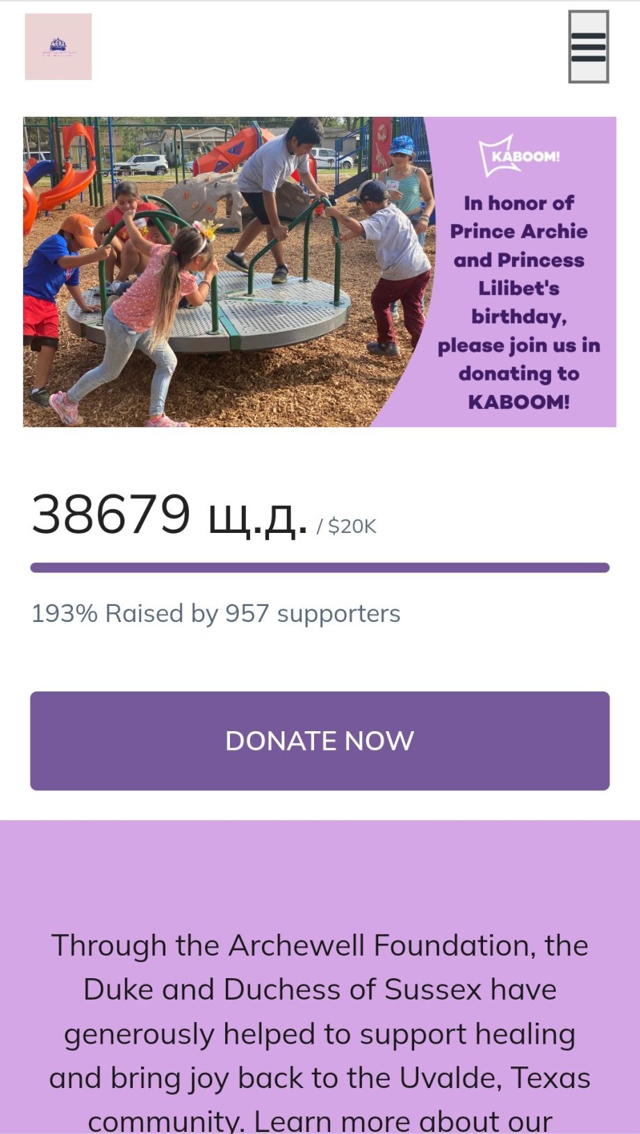 Както всяка година, феновете на Съсекс събират пари за благотворителни каузи започнати от самите Съсекс. Това е в чест на рождения ден на принц Арчи и принцеса Лили. Тази година са избрали каузата за изграждане на детски площадки след стрелбата в Увалде, Тексас, миналата година. За по- малко от един ден събраха 20 хиляди долара, все още няма два дни и са почти двойно повече.