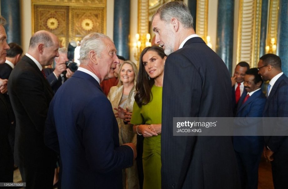Доколкото видях (не съм задълбочавала), Кралят и Уелс са поздравили хората по пътя за приема, тоест те са там вече и тоалетът е този, с който я видяхме по- рано. Не съм убедена, че е така, дано не подвеждам.