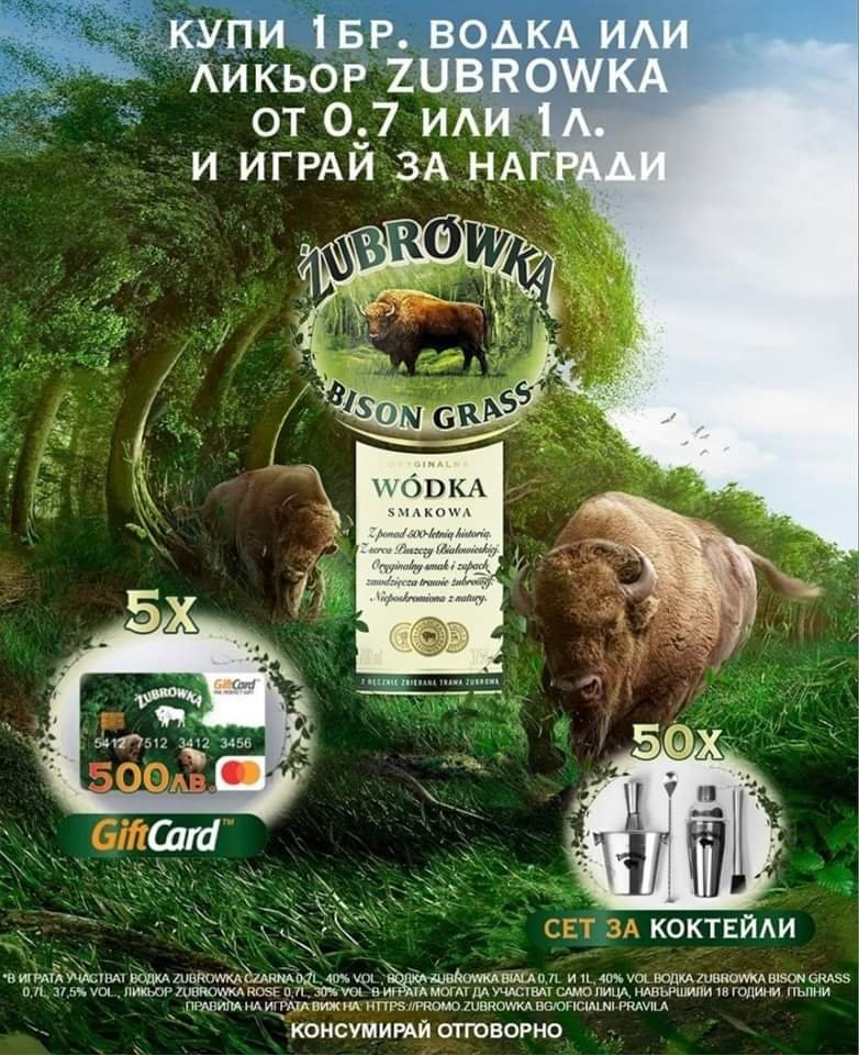 Купи 1бр. Водка или Ликьор Zubrowka от 0.7 или 1л. и играй за награди - 1 от 5бр. Gift Card TM на стойност 500лв. или 1 от 50бр. Сет за коктейли 💥