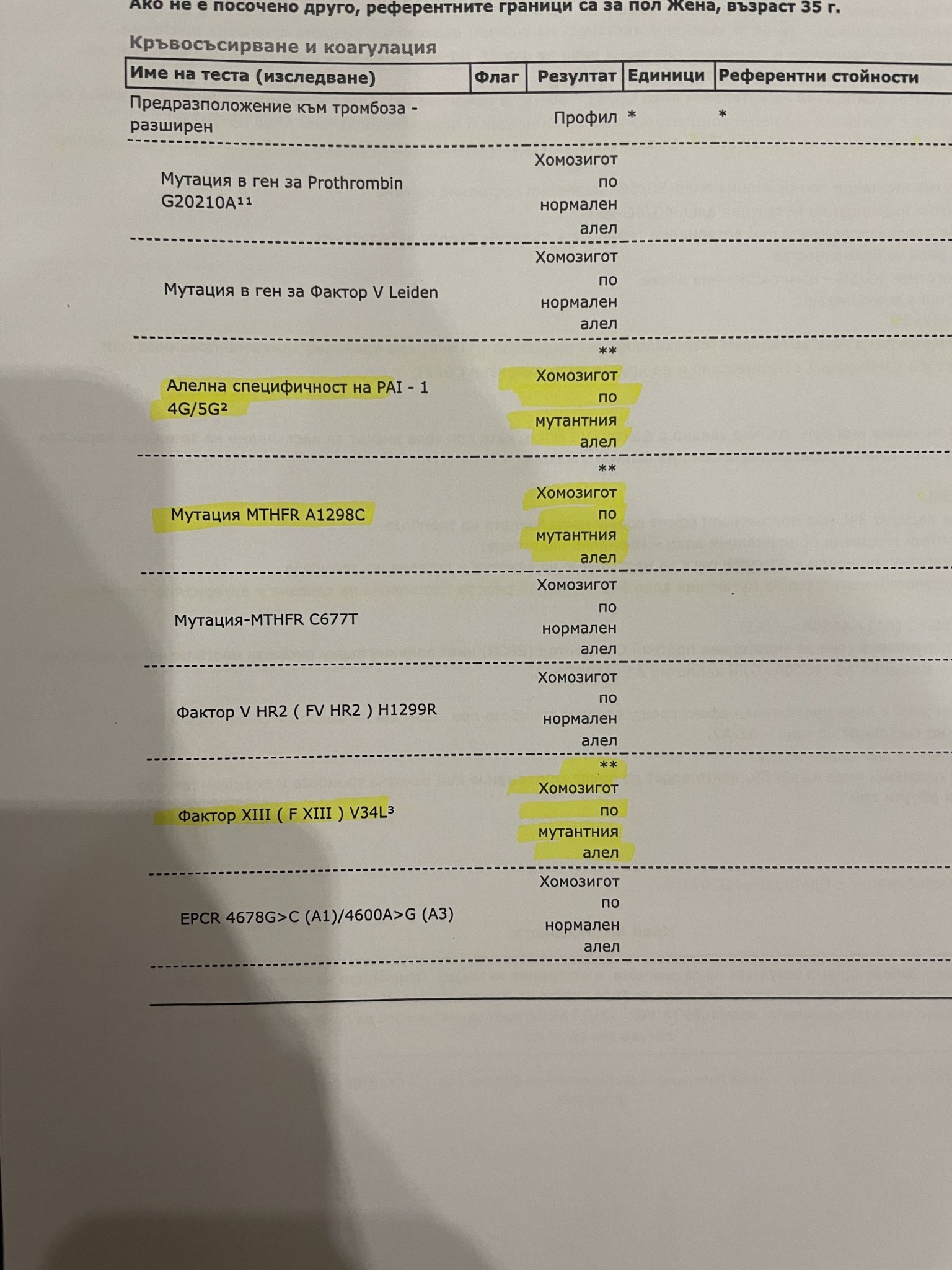 Двата ти гена са миск и стават все едно малко по тегави. Аз имам такива и с първата бременност бях на терапия с хепарин и аспирин, преди това имах 3 аборта. Сега вероятно ако утре всичко е точно пак ще съм.Иначе другия ген ти е за не усвояване на витамини сигурно го знаеш , трябва да си следиш стриктно витамините от гр Б и Д през и преди бременност , да приемаш само метилирани форми , понякога има нужла от високи дози защото не ги усвояваш.Общо взето тук за жалост адекватно малко кой се занимава , и сам си го контролираш . Консултирай се най добре с хематолог каква терапия да имаш за тромбофилията .