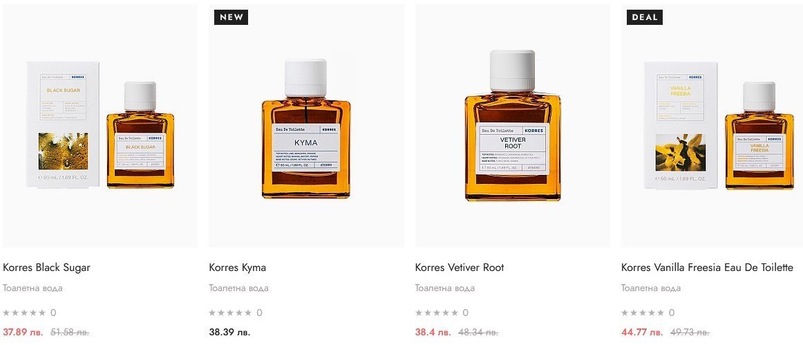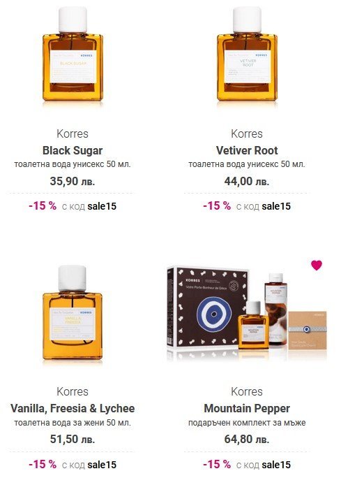 и в нотино има добри цени, но и доставка. все пак има потенциал за спестяване при получаване в магазина - https://www.notino.bg/korres/?f=1-3-24472-55544
