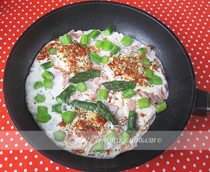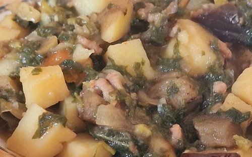 Коприва с картофи, солен кекс, бъркани яйца с кремвирши и папуда с наденица