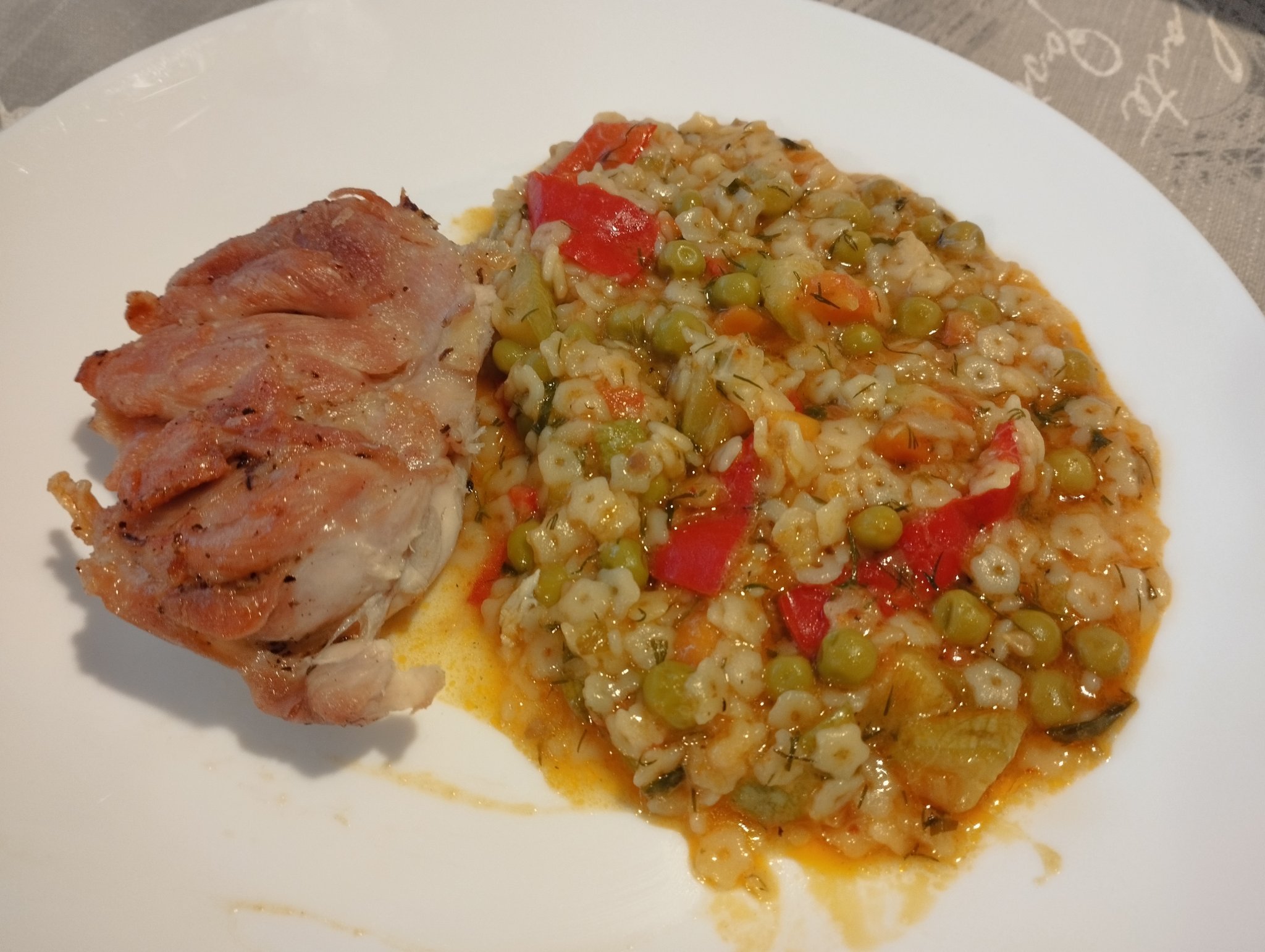 Пилешка пържола на фраера и зеленчуци с макарони звездички за гарнитура.