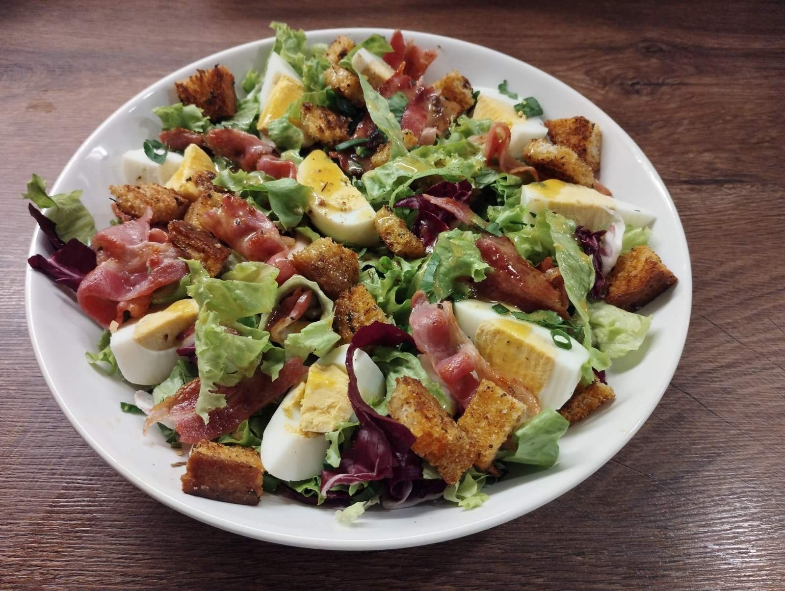 Салата с бекон, яйца, крутони и горчичен дресинг