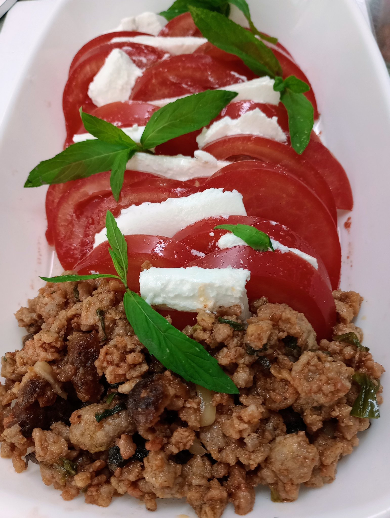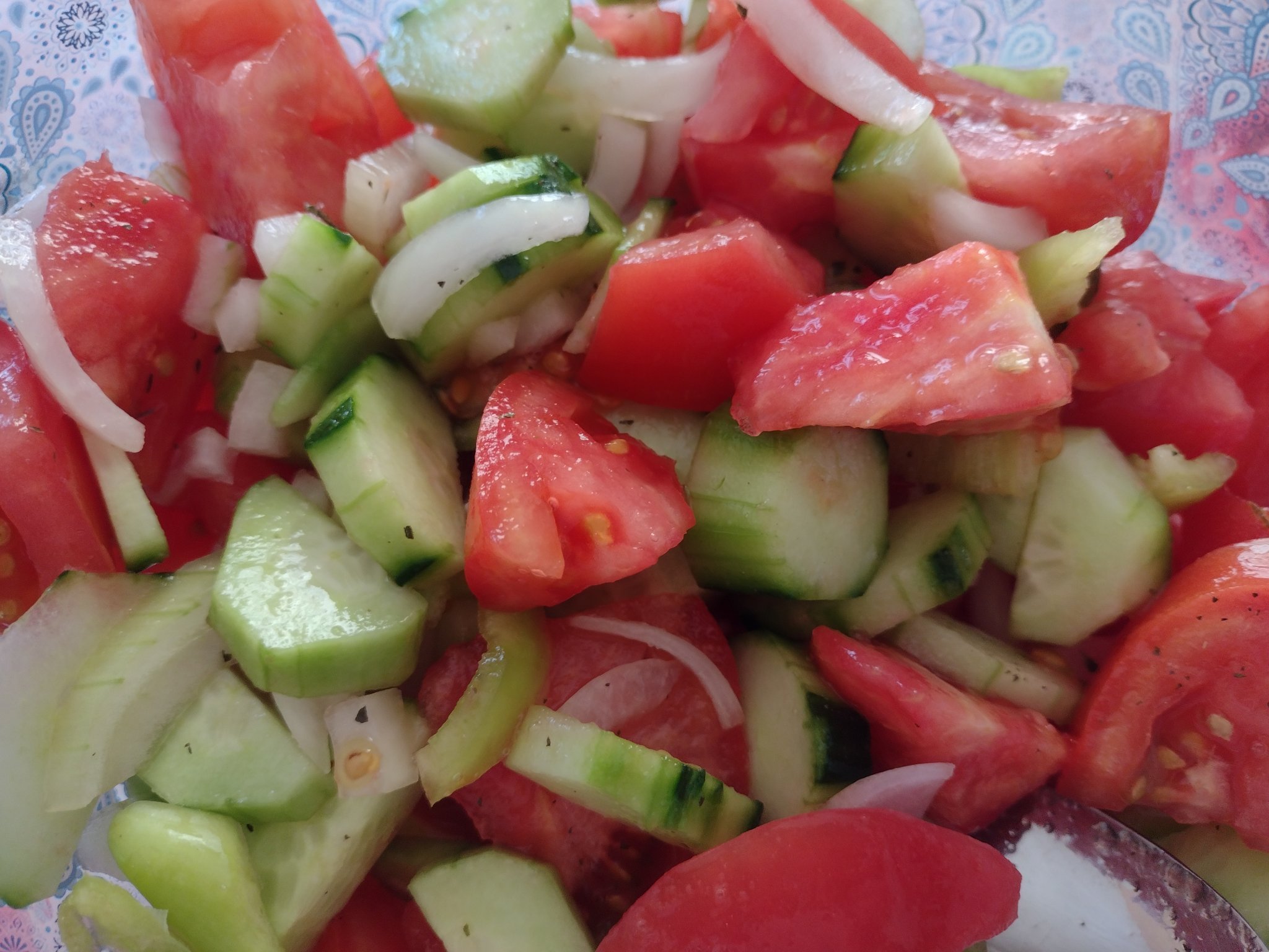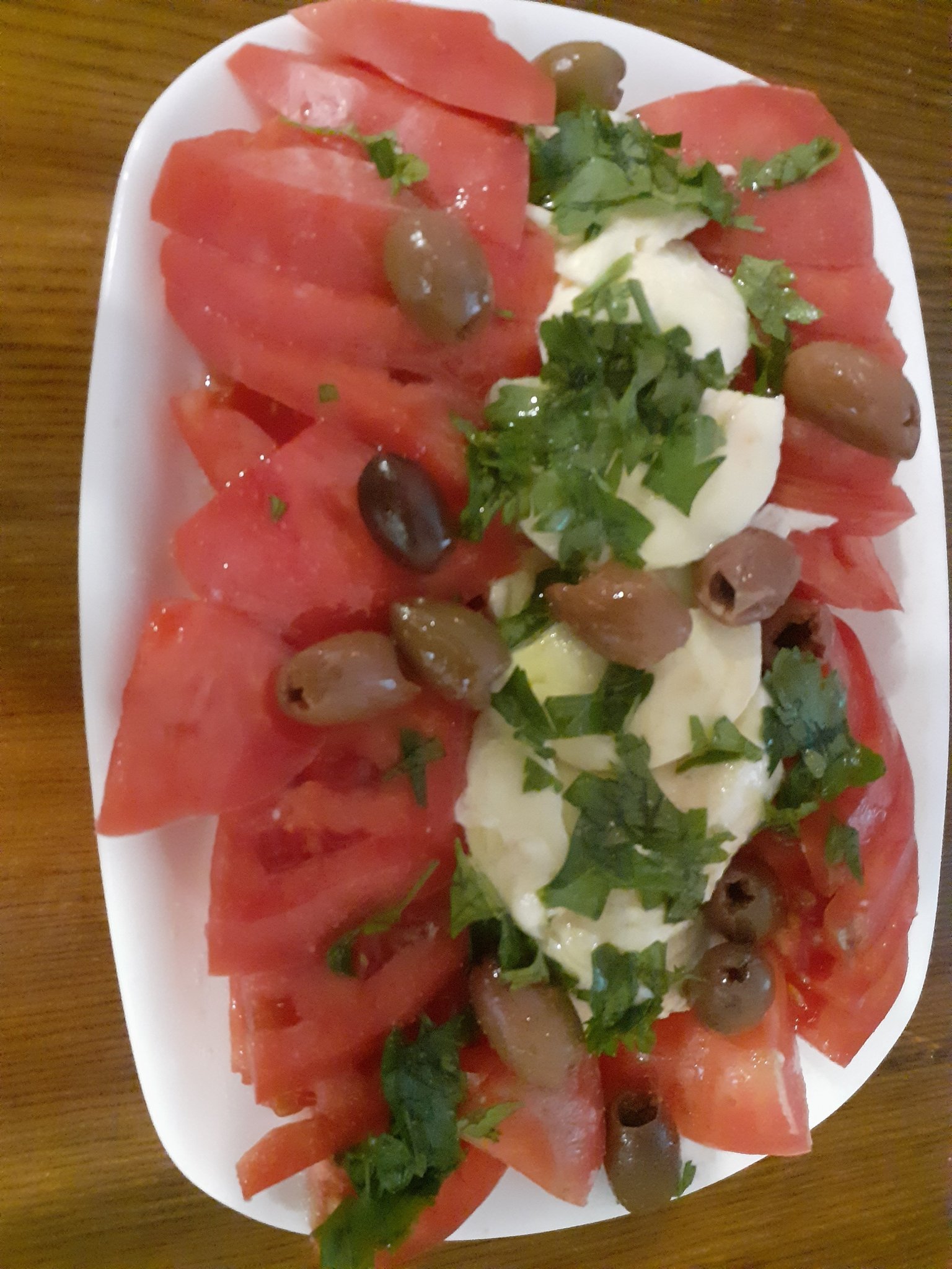Салата- домати, моцарела, маслини и магданоз, овкусена с оцет, зехтин и сол (трябваше да е капрезе, но някой забрави да купи босилек😄)