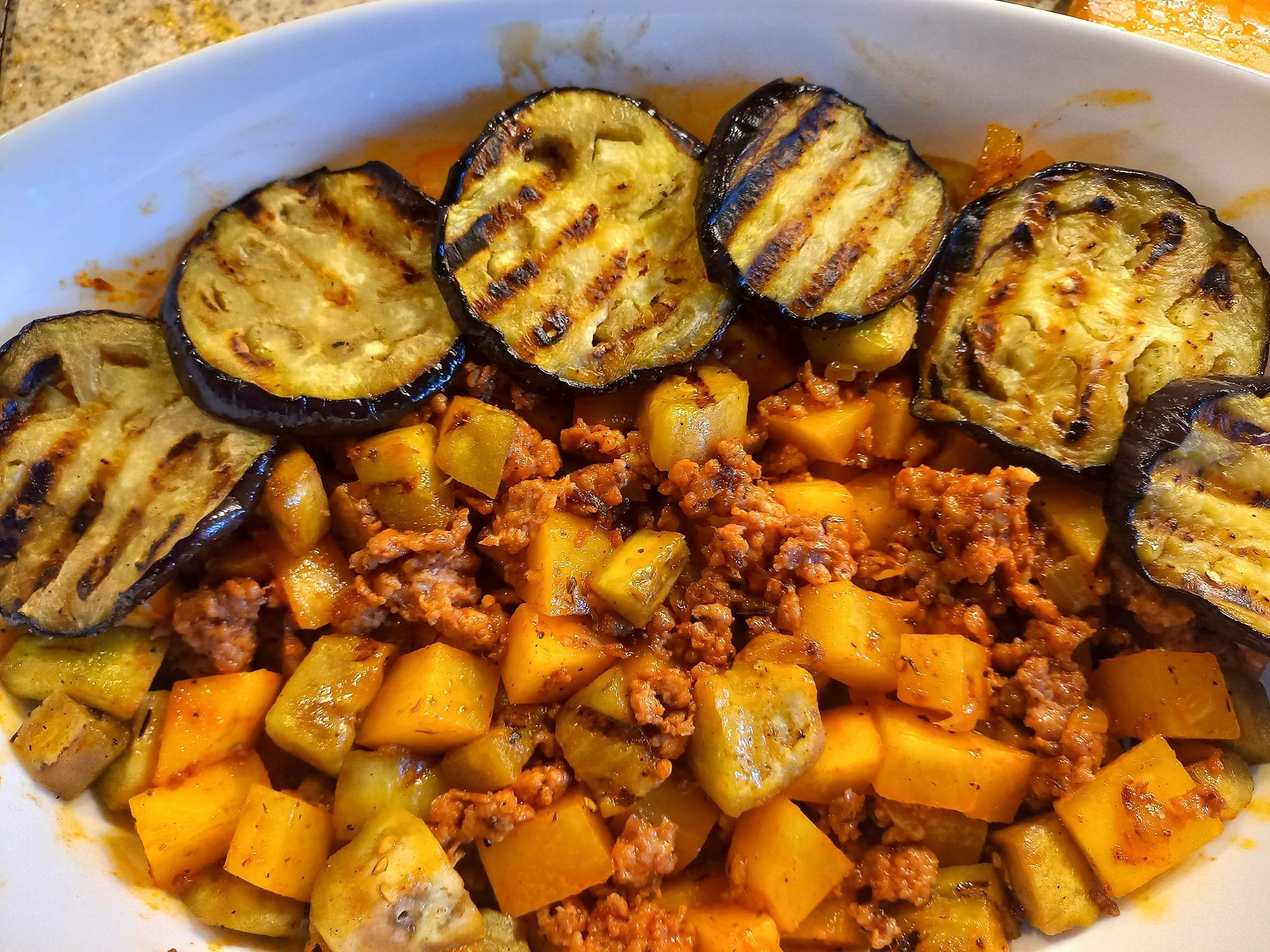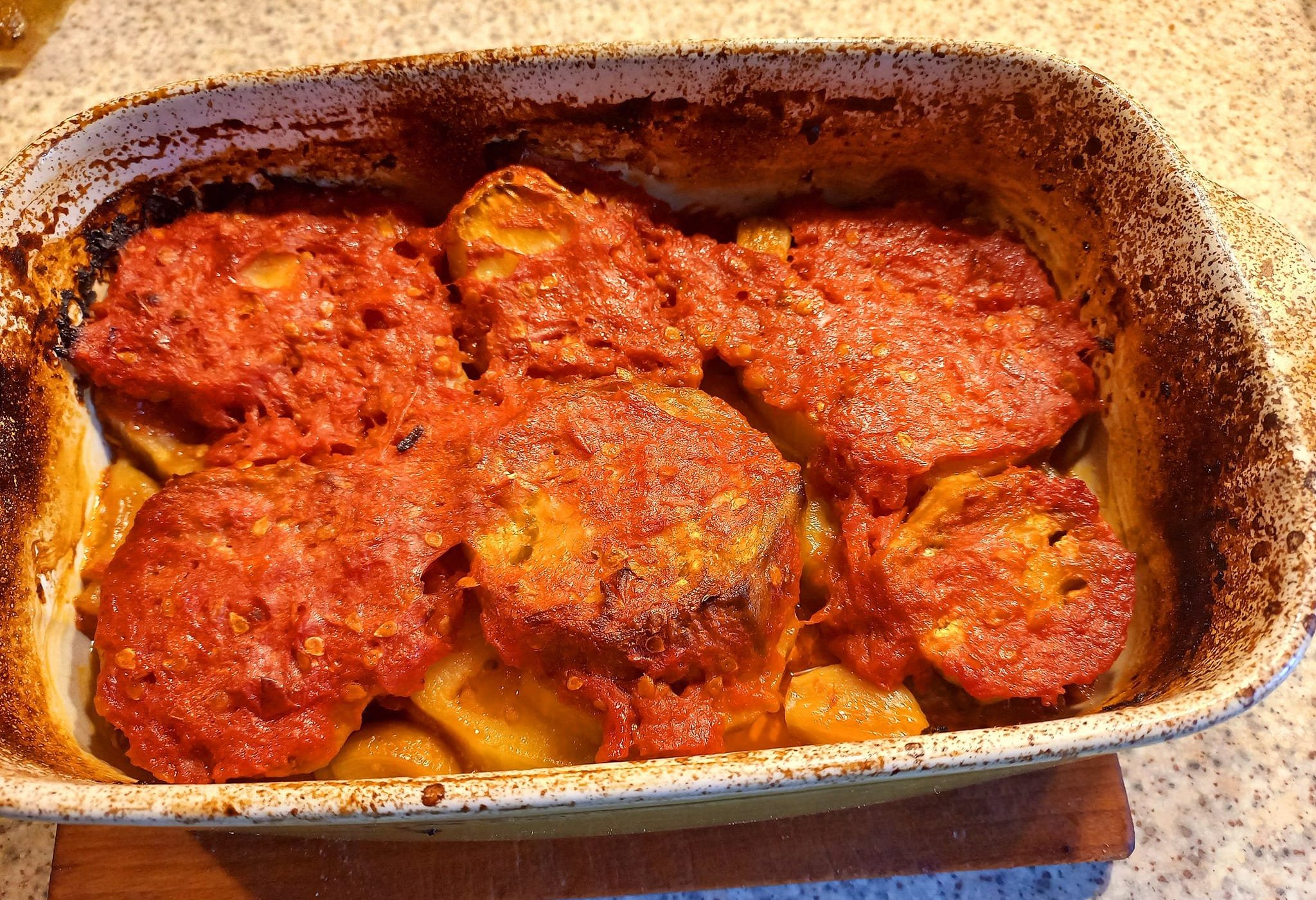 Мусака с картофи и патладжан. И патладжан с чесън и доматен сос се пече.