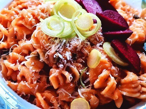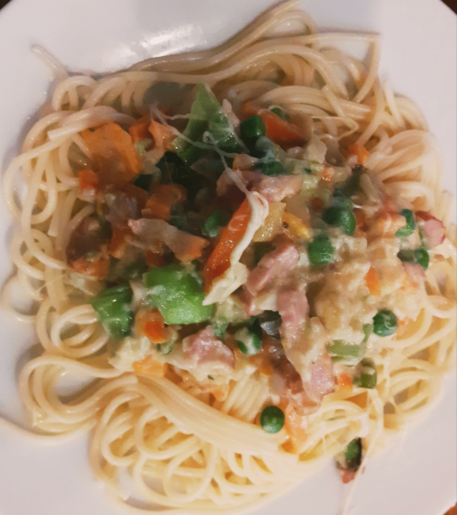 - за децата- спагети със сос, зеленчуци и бекон, поръсени с пармезан