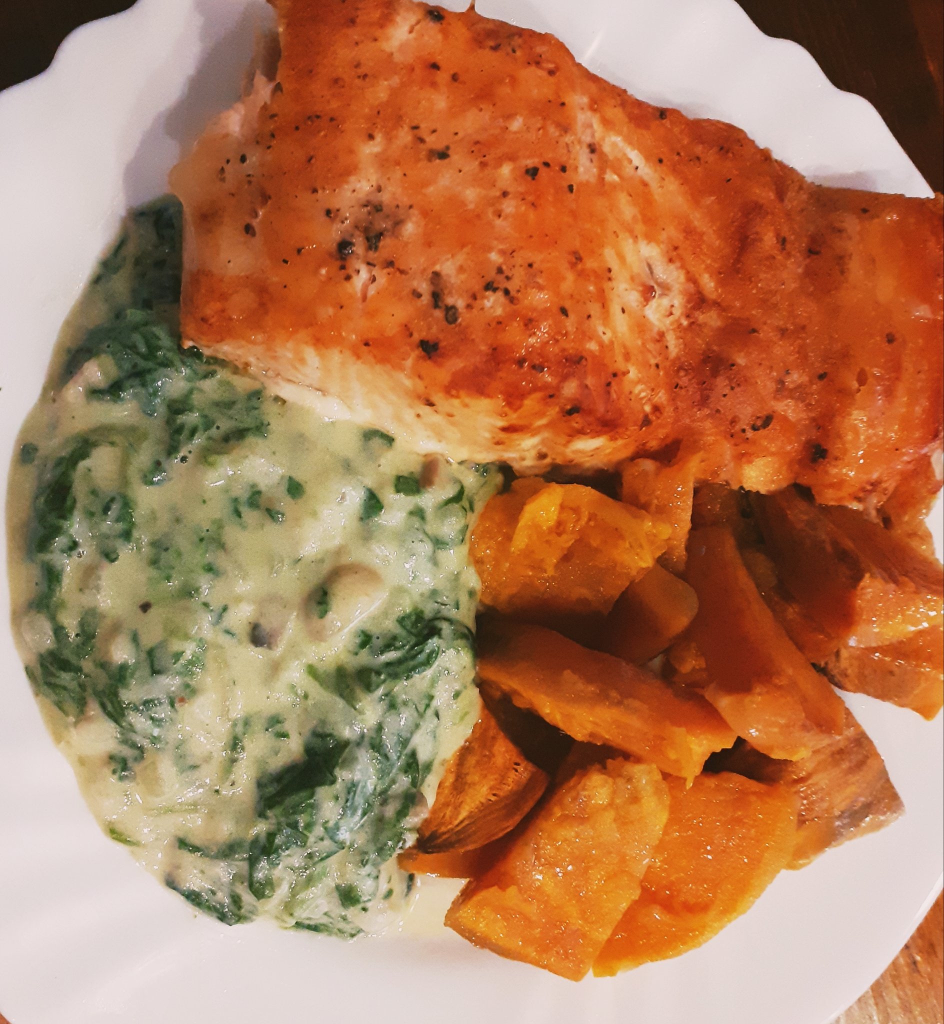 - за мъжа ми- печено филе от сьомга с гарнитура от печени сладки картофи и сос от спанак, лук, гъби, малко чесън, готварска сметана и топено сирене;
