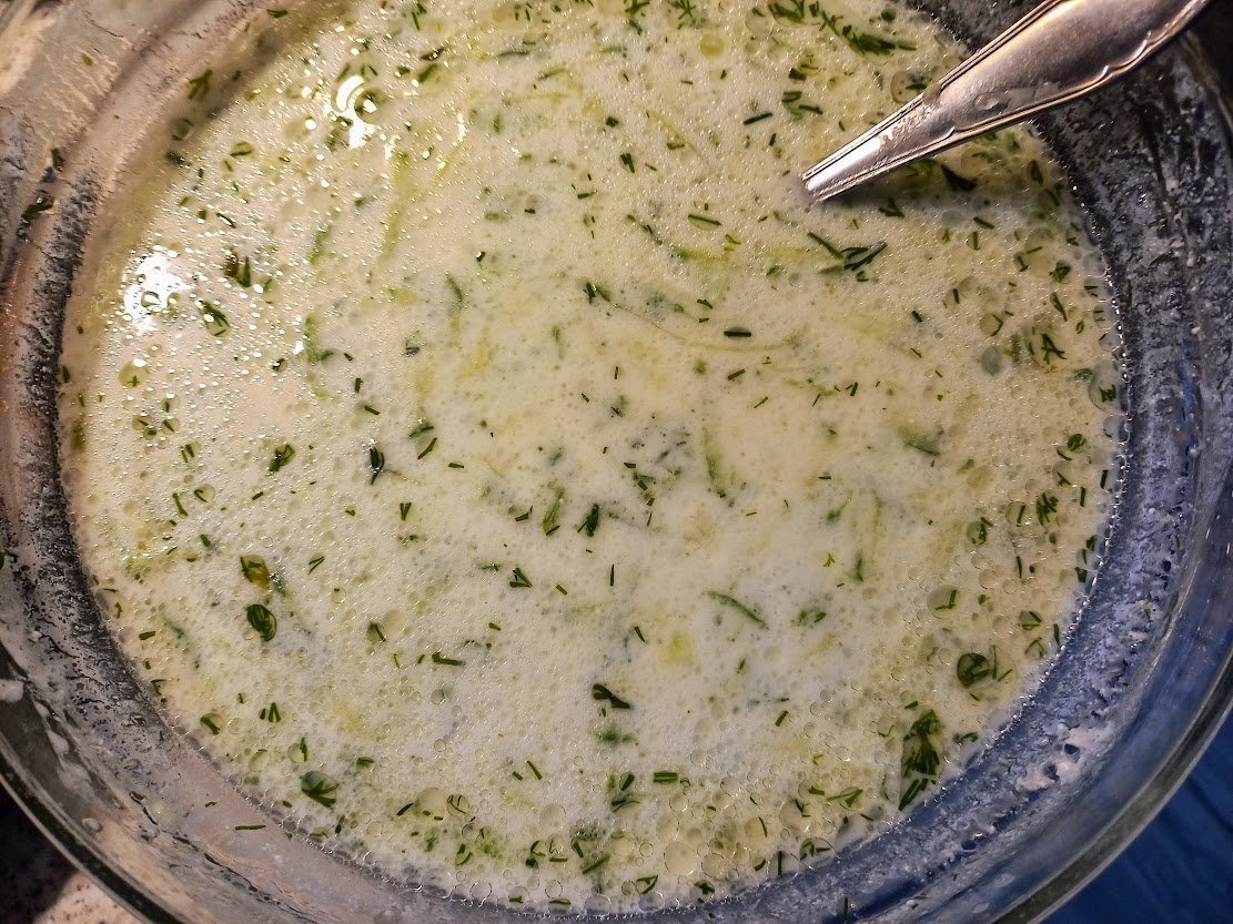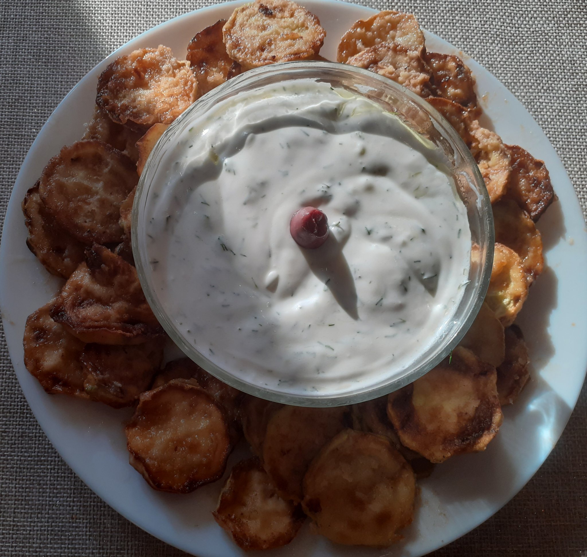 Пържени тиквички с дип от кисело мляко, майонеза, копър, зехтин и чесън;