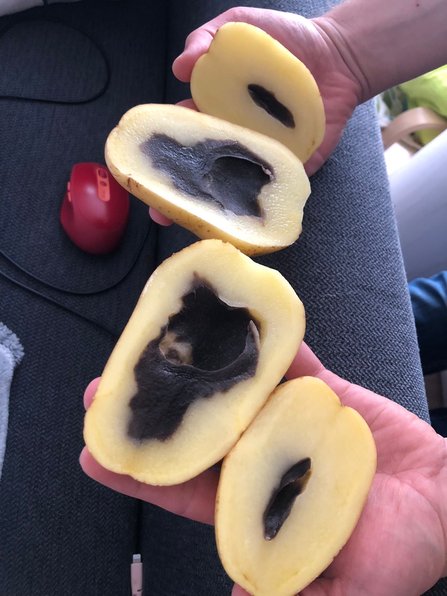 Много се дразня на такива картофи, които отвън изглеждат добре или поне ставали, а отвътре изскача някаква такава изненада...Особено като взимам по малко количество обикновено- случвало се е след почистването на чернилките едва да има за една една порция картофи за детето.
