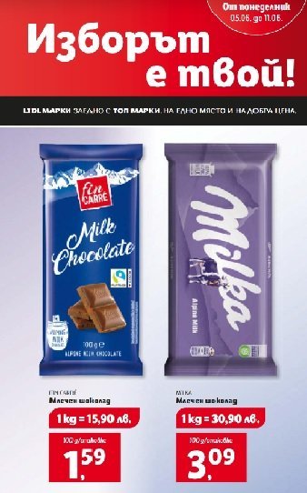 Малко са ми смешни как втора поредна седмица искат да си наложат някакви техни продукти и те дори не са на промоция, като ги сравняват с леко завишена цена на известна вече марка на пазара (примерно Милка, както е в снимката). Един вид да свикваме с високите цени и да правим сравнения евтино-скъпо, понякога с несравними по качество продукти (не говоря за Милка тук). Харесваме шоколадите на Лидл, но това е супер излишно.