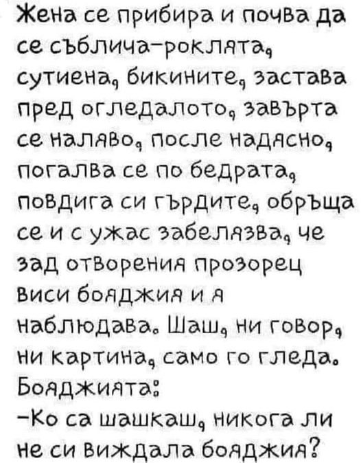 - Комшу,  къде погребахте жената? Да идем да поревем на гробо.