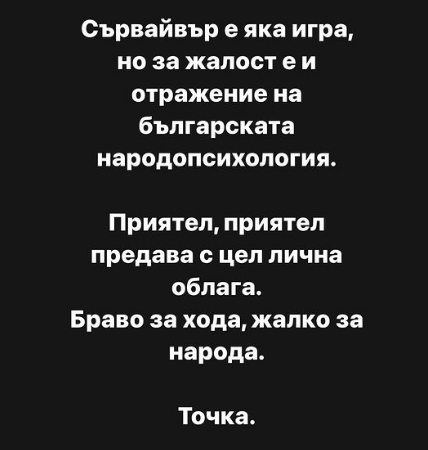 Като пиша всичко това държа да подчертая, че ми стана много гадно за Павел. За момент се поставих на негово място. Момчето не го очакваше и беше меко казано шокиран. Казах си докато гледам, че не го виждам в елиминационния дуел, защото психически няма да издържи, така и стана. Сигурно се е виждал като победител заради отличната си социална игра, но уви, не успя. Бе надхитрен. Може би все пак той, Едис и Геви не е трябвало да се отделят толкова често сами, а може и да са подценили Ермина и Цецо и да не си ги смятали за сериозна конкуренция. Явно вярваха и докрай, че петимата ще избутат до полуфиналните игри и там каквото сабя покаже. Подцениха ситуацията. А в Сървайвър винаги трябва да си нащрек.