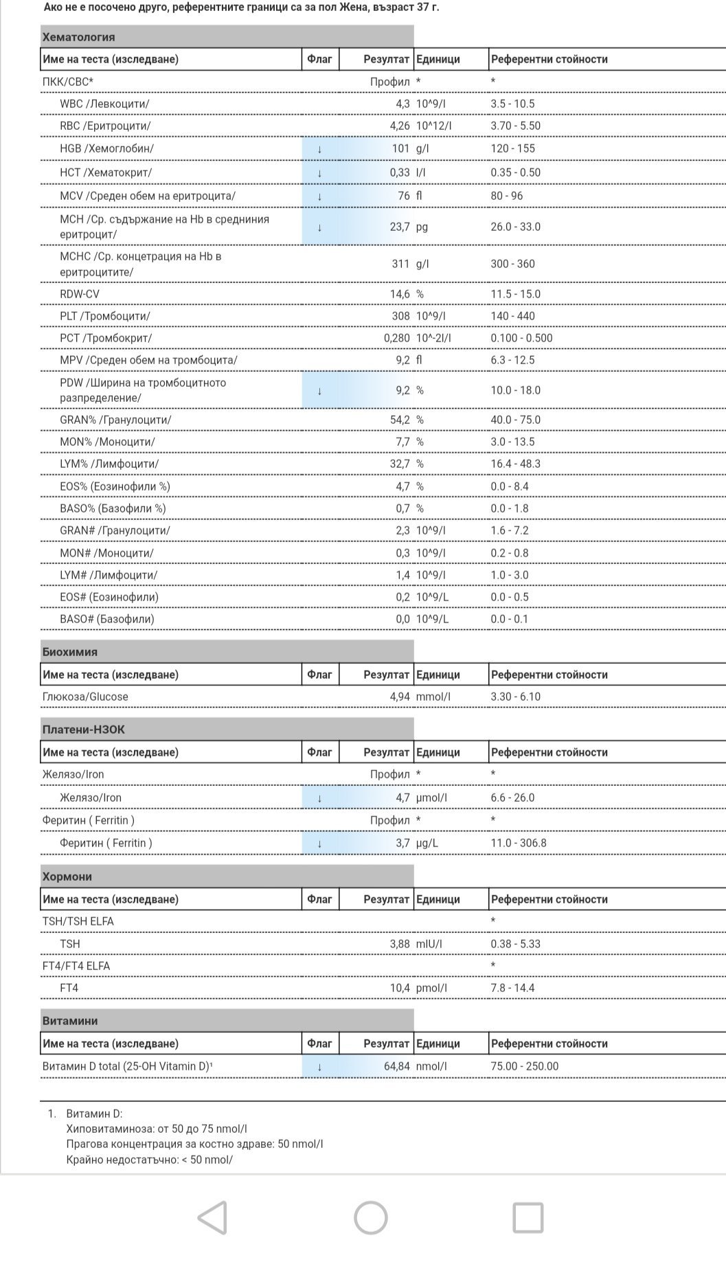 Сомалийски резултати. Отивай на хематолог, нищо не се наемам да казвам. Прилича много сериозно на анемия.