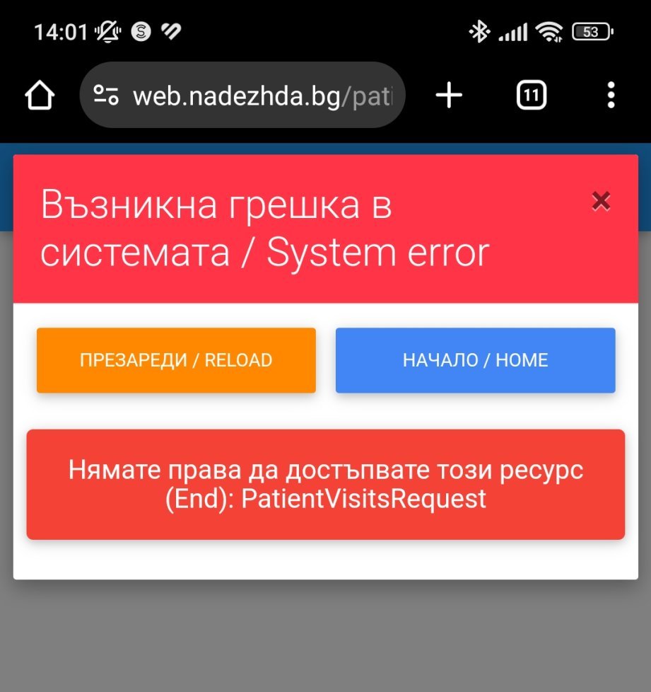 Здравейте, на някой друг дава ли му такава грешка в приложението на болницата? Не мога да достъпя нито изследвания, нито да запазя час, нищо..