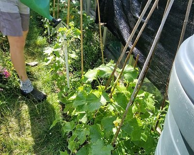 Шеф-градинарят полива краставиците, тамън са почнали да цъфтят