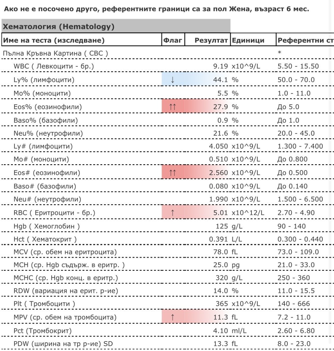 Не мога да помогна, не ми се е случвало и на мен, а на децата като вземаха кръв изобщо ги нямаше тези показатели в ПКК. Странно е, че детето си е ок и няма никакви симптоми на алергична реакция, а отчита нещо. Варианта е да го боцнат и в друга лаборатория и ако пак излезе нещо тогава вече тест за алергии.