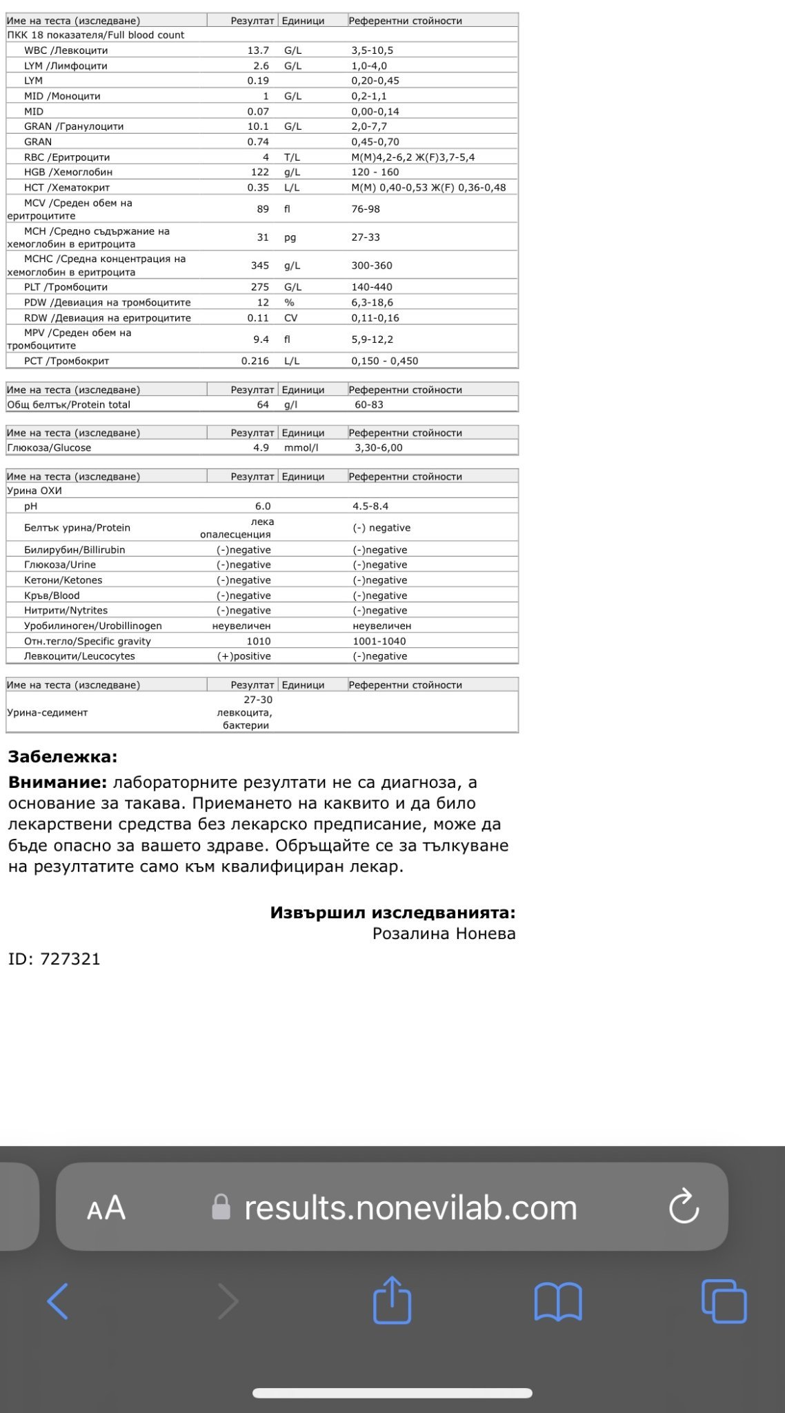 Здравейте, незнаех къде трябва да пиша, за това нарравих нова тема, бременна съм в 21 седмица, преди един месец имах завишени левкоцити, генеколога ми изписа хапчета за инфекция на пикочните пътища пих ги 10 дена и ги спрях, сега пак пуснах кръв и урина и излизат завишени левкоцити, белтък в урината, завешени гранулоцити и урина седимент 27-30 . Някой да е имал подобни резултати, притеснявам се, че може да е опасна инфекцията за бебето… а до понеделник има два дена… Благодаря!