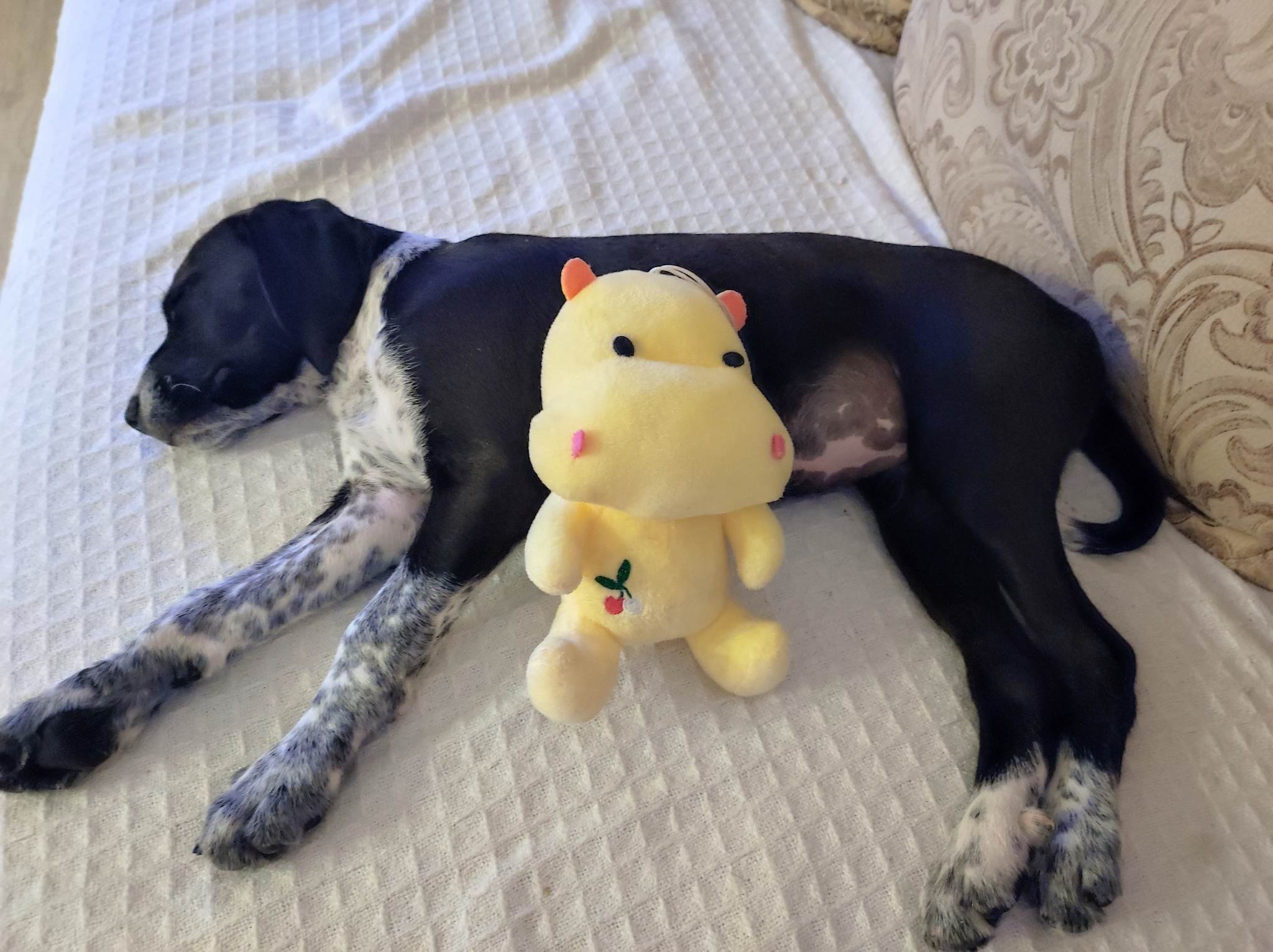 И нашият влачи обезобразени топки и играчки. Има един гумен дракон, чиято ръчичка само е ампутирана и това е the играчка. В музей ще я дам. Има и един бивш гумен заек, на който само ушите са останали. Тенис топките не може да каже човек какво са. Иначе и той много обичаше пръчки, но ветът ми се накара, че ще си прецака червата, щото наш'то не само гризе, ами си гълта треските. Беше с разстройство, явно заради тази лакомия и вече хич не мятам, а сам не се сеща.
