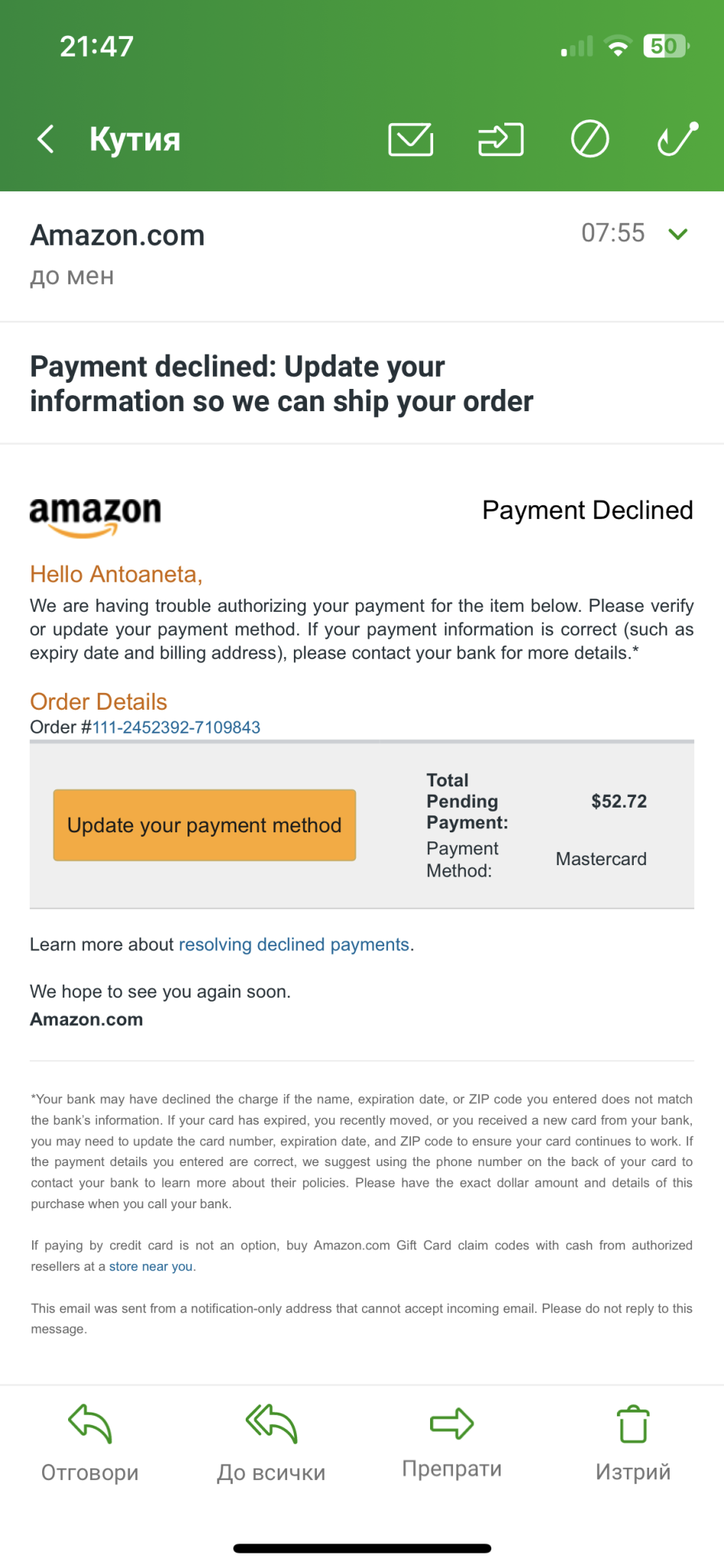 Здравейте! От 2 дни се опитвам да платя нещо в Amazon.com и не става , къде греша🤔? Моля, за помощ!!! Детето иска 1 кукла, добавям, пише че има доставка до БГ, въвеждам картата, билинг адрес , шипинг адрес ( съвпадат 2 та адреса) . И поръчката минава. След  известно време получавам мейл , че трябва да се актуализира плащането🤔